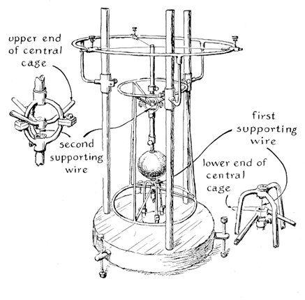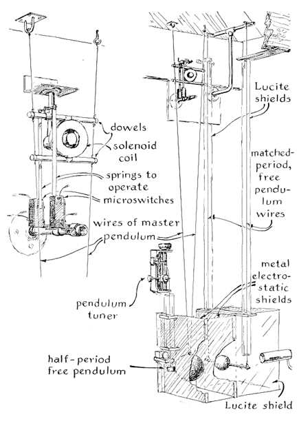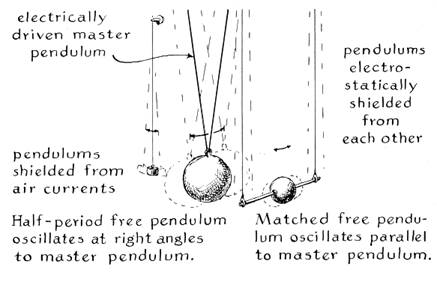 "The pendulum can be made in other proportions. I always analyze a new structure graphically before attempting construction. First I draw the straight, broken line of", establish point a and through it construct the perpendicular bb'. I usually make the length oa less than 20 percent of the length oc. Then with the arbitrary radius oc I draw the arc c'cc". Finally I construct the arc through which the bob will swing. This arc fixes the period at which the pendulum will vibrate. It is drawn through a, from an appropriate center point on the line of". I next draw the pendulum arm proportioned so that the bob will traverse the arc just drawn through a. With an arbitrary point such as e' on the arc cc" as a center, and with ac as a radius, a short arc is drawn to intersect the arc previously drawn through a, thus locating point e. A straight line that projects from ee' intersects of" at e", thus establishing the length e"e', which yields the arc ae and establishes the desired period of vibration. "Pendulums of this type can be made to swing in a single plane by constructing the member od' in the form of an inverted U. The legs are appropriately hinged to a supporting base. "The remarkable sensitivity of long-period pendulums can be demonstrated by adjusting the rate of vibration to five or fewer swings per minute and setting the apparatus on a heavy workbench. Level the base carefully. Then the pressure of a finger on the bench top will set the bob swinging. "A demonstration model of the pendulum just described was constructed to vibrate freely in all vertical planes. In this version of the basic mechanism the supporting lever takes the form of a circular cage, with radial cross braces attached at 120-degree intervals to the top and bottom rims [see Figure 3]. The bottom of the cage is flexibly supported at the center, where the cross braces meet, by a short steel wire that extends downward from a small tripod rigidly anchored to the base. The pendulum arm, dd", is similarly flexibly coupled to the radial cross members of the cage at the point where they join at the top. When the pendulum arm is proportioned so that the bob traverses an arc with a radius of 200 feet, the bob vibrates at a period of about eight seconds. It then duplicates within a space of less than two cubic feet the performance of the huge pendulum that was set up more than a century ago by the French physicist Jean Bernard Leon Foucault in Paris to demonstrate the rotation of the earth. "Pendulums equipped with small bobs swing for a shorter time-given the same amount of inherent loss-than those that have large, heavy bobs because the small bobs store less energy. A good pendulum equipped with a four-pound bob will normally swing for about an hour when it is given an initial push of 10 degrees, if care has been taken to minimize frictional losses at the points of suspension. The duration of the swing could not be extended appreciably, however, even by reducing all frictional losses to zero, because a substantial amount of energy would still escape through the supporting structure. The swing of the bob causes the support to sway from side to side. This vibration is communicated to the bench, the floor and the ground. The loss through the support can be minimized only by anchoring the apparatus to a massive pier. Such piers are costly and cumbersome. A practical solution is to compensate for the loss by driving the pendulum electrically. Several effective driving mechanisms for pendulums of the Foucault type have been described in this department [June, 1958]. "While I was considering the minute quantity of energy required to sustain vibration in a well-made pendulum, it occurred to me that perhaps a pair of pendulums could be used to demonstrate local pulsations in the gravitational field. If the pendulums were closely spaced and tuned to the same period, gravitational attraction between the bobs should cause the pendulum at rest to start swinging when its companion vibrates. To test this assumption I erected two pendulums side by side [see Figure 4]. Each of the bobs was suspended by two nonmagnetic wires about five feet long. In the case of the master pendulum, which would be driven electrically, the wires were arranged in the form of a V so that the bob would swing in a fixed plane. A lead sphere four inches in diameter and weighing 14 pounds served as the bob. The suspension wires were attached to screw eyes in the ceiling. "The driving mechanism consisted of a coil, which had several hundred turns of magnet wire and was attached to the suspension wires near the top, and a permanent magnet in the form of a cylinder that occupied the space in the center of the coil. One end of the magnet was anchored to the wall. Limit switches were actuated by the suspension wiles at each end of the swing. One switch, when closed, applied current to a relay equipped with two contact springs. One contact spring, which was connected in parallel with the limit switch, maintained current in the coil of the relay when the switch opened, thus keeping the relay locked down when the suspension wires swung away from the switch. The second contact spring applied current to the driving coil. The magnetic force between the field of the coil and that of the magnet drove the pendulum through one swing. At the end of the swing the second limit switch was operated by the approaching suspension wires. This switch interrupted the current in the coil of the relay, releasing the relay. This action removed power from the coil during the return swing. "The second pendulum, which was designed to sense any gravitational effect, consisted of a copper rod 10 inches long suspended at each end by nonmagnetic wires attached at the top to a metal bracket. The bracket was anchored to the cinder-block wall. A three-quarter inch sphere of lead at the center of the copper rod served as the bob. The rod vibrated in the direction of its axis when the pendulum swung. I tun