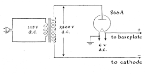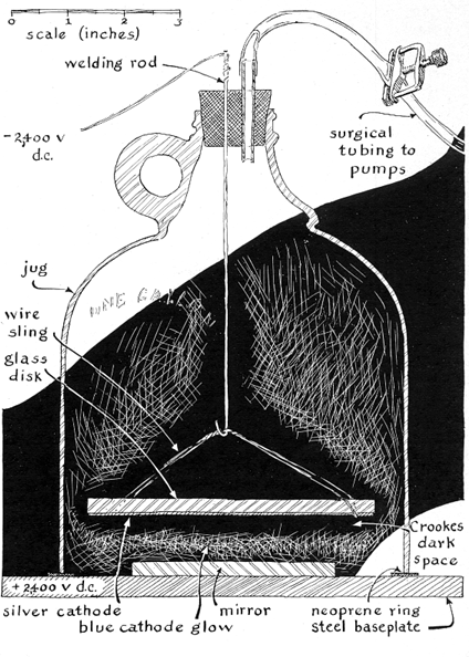 "Cathodes in the form of a flat disk are suspended by a wire spider from a hook at the bottom of the negative electrode. Both metal and electrical energy can be conserved by covering the top of a flat cathode with a disk of window glass. The glass cover confines the electric discharge to the cathode's lower surface, which faces the mirror below. The distance between the cathode and the mirror can be adjusted by sliding the welding rod up or down through the rubber stopper. "My vacuum pumps consist of two modified compressors from old refrigerators. The compressors are operated in reverse. I bought them for $10 from a dealer in appliances. Details of the modification procedure are determined by the design of the compressor, which varies in minor respects with the product of each manufacturer. In general, however, all compressors include a check valve that must be removed and a bypass line of copper tubing that runs between the housing and the check valve. The copper tubing must be cut and the ends sealed. "A wire strainer will also be found somewhere in the inlet tubing. If the strainer is plugged by oil, the compressors, which operate in tandem, will not reduce the air pressure in the bell jar below 10 torr The oil can be blown from the strainers or the strainers can be removed. In the latter case care must be taken subsequently to prevent dirt or other foreign material from entering the units. "Most refrigerator compressors are now sealed in a gastight housing. Access to the working parts can be gained only by cutting the housing apart. I do it with a hacksaw. "Sputtering apparatus can be operated on either alternating current or direct current at potentials ranging from about 1,000 volts to 15,000 volts. Films deposited by direct current appear to be denser and to have higher reflectivity than those deposited by alternating current. The density and reflectivity of the film as well as the rate of deposit also appear to be influenced by the amplitude of the current, which can vary from 10 to several hundred milliamperes depending on the area of the cathode. I deposit most films with a current of from 25 to 60 milliamperes. None of my sputtered films is as dense or as bright as those deposited by the vaporization technique, but they perform adequately and I enjoy trying to make better ones. "My power supply was improvised from a vacuum tube and three transformers that I bought inexpensively on the surplus market. The primary windings of the transformers were designed to operate from a source of 115 volts and 60 cycles. They were connected in parallel. The secondary windings develop a potential of 800 volts and were connected in series. The combined output is 2,400 volts. The output is converted to direct current by inserting a type-866A vacuum tube in series with one of the output leads [see Figure 2]. The tube is a diode. "Essentially the apparatus functions as a gas-discharge tube of the Crookes type. When air pressure inside the bell jar is reduced and a potential of 1,000 volts or more is connected to the cathode and to the baseplate that functions as the anode, thin spark-like streamers will ultimately appear between the cathode and the anode. As the pressure continues to drop the streamers will be replaced by a blue glow that covers the cathode. "At still lower pressure a dark region will appear between the cathode and the anode. This phenomenon is known as Crookes dark space. Simultaneously a bright glowing film will cover part or all of the cathode. The extent of this glow varies with the current. Crookes dark :pace appears at about .1 torr, expands as the pressure is reduced and becomes relatively thick at a pressure of .01 torr. "Metal will deposit on the glass most effectively, at least during my experiments, when the position of the cathode is adjusted to the point at which Crookes dark space almost touches the glass. At comparatively low voltages the glow may fail to appear. In this case the discharge can be started by touching the bell jar with the high-voltage terminal of a Tesla coil, an Oudin coil or even a spark coil of the type used in the ignition system of automobiles. "Current in the bell jar varies inversely with the resistance, hence a variable resistor can be used for adjusting the current and, as a consequence, for adjusting the rate at which metal is deposited. The resistance of the diode varies with the temperature of its cathode and can be controlled by adjusting the current applied to the filament of the tube. "Glass must be well cleaned before coating. The cleaning need not be as thorough as is required for chemical coating or for films applied by the evaporation technique. I merely wash the glass with household detergent, rinse it with water and put it aside to dry. Smudges left by dried water droplets are wiped off with a tuft of absorbent cotton. The thin film of vegetable fat that is deposited on the glass by the cotton vanishes during the subsequent ionic bombardment. "The apparatus is simple to operate. The cleaned glass is placed on the baseplate along with the greased neoprene ring. The perforations of the stopper are also greased, as is the tapered portion of the stopper. All vacuum connections are similarly greased. "The bell jar, to which the cathode has been assembled, is inverted over the base and the ground edge is pressed firmly against the neoprene ring to ensure a gastight seal. The cathode is then tentatively adjusted to a height of about three-quarters of an inch above the glass. The pumps are started. After about two minutes I apply the high voltage. Pressure inside the bell jar need not be measured. The proper operating pressure can be judged by the character of the glowing gas. No discharge appears at atmospheric pressure. "When the pumps have been operating for a minute or so, depending on their speed, the characteristic blue glow will form close to the cathode and subsequently float away, forming Crookes dark space. When the dark spac