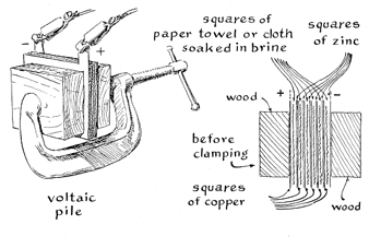 A cell that demonstrates essentially the same properties can be assembled inexpensively at home by substituting copper for the silver. The experiment can serve as an introduction to the basic properties of electrochemical cells in general. Both copper and zinc, in the form of sheet metal known as "flashing," can be bought from tinsmiths and from most dealers in hardware. In order to make a small cell cut the sheets into two-inch squares and scour the surfaces with steel wool. Cut a few similar squares of cotton cloth or paper toweling. Soak them in a saturated solution of table salt and tap water. (Such a solution, at a given temperature, will dissolve no more salt.) Sandwich a sheet of wet cloth or paper between a copper plate and a zinc plate. Place the sandwich between flat wooden blocks and squeeze it with a C-clamp or a vise. Connect the positive terminal of a voltmeter to the copper plate and the negative terminal to the zinc plate. The pointer of the meter will swing to about .8 volt. An ammeter connected in the same way will indicate a current of about 15 milliamperes. The current will drop to approximately five milliamperes within a minute or two as reaction products accumulate in the cell. Higher voltages can be generated by building a pile of cells. Place the copper plate of one cell on top of the zinc plate of its neighbor below, and so on. Clamp the completed pile and attach lead wires to the end plates. The output potential will increase in direct proportion to the number of cells in the battery. The maximum current delivered by the battery will vary directly with the area of the plates. Volta assembled batteries of 100 or more cells. With a somewhat similar battery the English chemist Sir Humphry Davy sent electric current through molten salts and in 1807 succeeded in isolating the alkali metals sodium and potassium by electrolysis. Shortly thereafter the Royal Society of London constructed a battery of 2,000 cells, the plates of which measured 2 1/2 feet by six feet. This giant powered the first carbon arc light and led to the discovery of the laws of electrolysis. Volta's battery, although it was primitive in design, must not be dismissed as a harmless toy. The experimenter working with more than 20 cells must exercise caution. As Volta learned, electricity can make one's head roar; it can also be lethal.