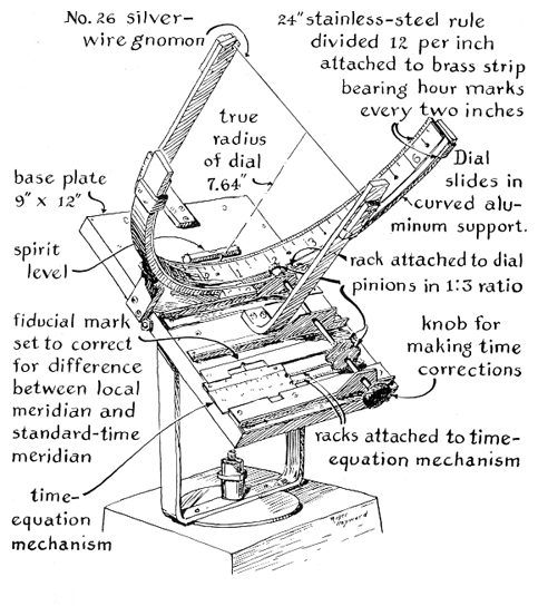 Every generation includes a substantial number of amateurs who design sundials, a hobby that continues to recruit enthusiasts even in these days when wristwatches are almost as common as shoes. To the collection of unusual dials that have appeared in recent years is now added one that tells clock time and daylight saving time. William C. Boyd, professor of immunochemistry at the Boston University School of Medicine, is the designer. He writes: "Considering the thousands of years that sundials have been used, it seems unlikely that an amateur could invent a new design. It may well be that mine is not new, but I have never come across one like it, even though it is based on a simple principle. Its novel feature is an adjustable dial. The time, as indicated by the shadow of the gnomon, can be advanced or retarded by rotating the dial, just as a clock can be reset by moving the hour hand. "The dial must be reset almost every day to keep the indicated time in step with clock time, because the shadow cast by the gnomon 'runs' faster or slower than clocks by a predictable amount that varies throughout the year. This v predictable variation, known as the equation of time, can be recorded as a table-of corrections that dictates the setting of the dial for every day of the year. Data for compiling the table are available in standard references such as The American Ephemeris and Nautical Almanac. (This reference is available in most public libraries and can be bought from the Superintendent of Documents, U.S. Government Printing Office, Washington, D.C. 20402.) I engraved the table on a metal plate that is mounted on the base of the dial. A photocopy of the table posted indoors would serve as well. "The instrument can be built by anyone with access to modest workshop facilities. My model was made largely of do-it-yourself aluminum that I bought at a hardware store. The apparatus is held together by brass machine screws that were tapped into the aluminum. I sidestepped the most difficult part of the job-graduating the dial-by using part of a carpenter's square. The square, made of stainless steel, had 1/12-inch graduations. I used a hacksaw to cut a two-foot length, which I then bent into a semicircle [see illustration below]. The semicircle corresponds to a 12-hour interval; the smallest division represents 2 1/2 minutes. All the other dimensions of the instrument are determined by the size of the dial. "The graduated dial slides on the surface of a semicircular aluminum support and is loosely attached to the support by brass screws that move in slots. The dial is restrained laterally by stops at the edges of the support and is rotated back and forth on its support by a brass rack bent to the same radius and soldered to the dial. The rack is engaged by a pinion gear fixed on one end of a shaft. The opposite end of the shaft is fitted with a knob that extends beyond the edge of the base. To reset the time indicated by the dial one merely turns the knob one way or the other. "Another handy feature that increases the accuracy of the instrument is a time-equation mechanism that displays the setting of the dial. The mechanism consists of a flat graduated scale, geared to the dial by a pair of straight racks that engage a pair of gears mounted on the adjustment shaft. The graduated scale slides in a set of ways. The driving gears have three times as many teeth as the pinion that engages the rack of the dial, hence the linear displacement of the flat scale exceeds by threefold the movement of the dial. This multiplication of motion increases by threefold the precision with which the dial can be set. A change of 1/4 inch corresponds to a time interval of 2 1/2 minutes. The scale of the indicator was cut from a machinist's steel rule. I ruled a vernier scale by hand. The vernier is fixed to the base of the instrument, adjacent to the graduated edge of the machinist's rule. "The gnomon consists of a 9.4-inch length of No. 26-gauge silver wire supported 7.64 inches above the dial by a pair of adjustable blocks carried by arms made of aluminum strips. The base of the instrument is constructed for rotation in both declination and azimuth, so that the gnomon can be pointed both to true north and parallel to the earth's axis. When the gnomon is so aligned, it is possible even without reference to the vernier scale to set the dial to within 15 seconds of local clock time. On July 11 of this year I made a total of 18 readings, spaced roughly 40 minutes apart, and checked each reading against a good watch that had been set by reference to time signals broadcast by radio station WWV of the National Bureau of Standards. The maximum error amounted to +.5 minute and the average error to +/-.17 minute, or about 10 seconds. Many watches are not as good. Moreover, errors made by the sundial are not cumulative. On the other hand, one does need the sun."