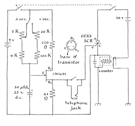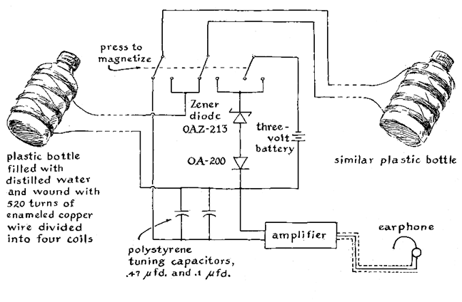 "The terminals connect directly to the push-button switch. The switch consists of the contact assemblies of three microswitches. The assemblies are mounted so that one plunger actuates all three assemblies. When the plunger is released, the battery circuit is broken and then the coils are reconnected to the amplifier. "The signal from the coils amounts to only about 10-16 watt, equivalent to the radiant energy that enters the eye from a candle 16 miles away. The amplifier must therefore be of the type that develops high gain and little noise at the desired frequency of 2,025 cycles. It should also be compact and light, and it should impose a minimum load on the battery. "My amplifier was designed around inexpensive germanium transistors. The first transistor of the string develops only about as much noise as is generated by the random motions of electrons in the copper coils. Noise is suppressed further by the insertion of a tuned transformer between the third and the fourth transistor of the string. The magnetic core of the transformer is of the 'pot' type: it has roughly the shape of a hollow doughnut equipped with a movable plug in the central hole. The torus contains two coils of wire, which are the primary and the secondary winding of the transformer. "The unit passes only the narrow band of frequencies determined by the position of the movable plug and the tuning capacitor. The position of the plug is set by a screw adjustment to pass the desired 2,025-cycle tone generated by the protons. I use the Mullard Type LA2416 pot core, which I bought (together with the transistors) from Mullard Ltd., Mullard House, Torrington Place, London WC 1. Mullard is a branch of Philips' Gloeilampenfabrieken of Eindhoven in the Netherlands. "The design of the tuned transformer is fairly critical. In particular the Q of the completed transformerthe ratio of the average energy stored in the transformer to the energy that is dissipated per 1/3.14 cyclemust be at least 160. Any pot core that, when wound, will yield this Q can be substituted for the Mullard Type LA2416. "The primary winding of the transformer consists of 120 turns of No. 42 S.W.G. enameled copper wire; the diameter is .004 inch, equivalent to No. 38 A.W.G. The coil is wound first on an insulating form and covered by a thin layer of paper insulation. The secondary coil of 1,170 turns of No. 40 S.W.G. enameled copper wire, tapped 30 turns from the inner end, is then wound over the primary. (The diameter of the wire is .0048 inch, approximately equivalent to No. 36 A.W.G.) The secondary winding, when it is in place within the pot core, has an inductance of one henry and is tuned to the resonant frequency of 2,025 cycles per second by a capacitor of .006 microfarad. I used a capacitor that was made with polystyrene insulation to minimize the loss of energy and thereby minimize the width of the band of frequencies transmitted by the resonant circuit. "A signal of 10-18 watt can just be heard above the noise of the coils and amplifier. The gain in voltage is about two million, so that certain parts must be shielded to prevent the amplified signal from feeding back into the low-energy parts of the circuit. I installed the amplifier and its nine-volt dry battery in a tobacco tin. The tuned circuit was isolated from the remaining parts by metal partitions that divided the housing into three compartments and thus shielded the input and output portions of the circuit from each other. The internal layout of the parts is not critical. "The assembly is completed by tuning the pot-core transformer. This adjustment is determined by the local strength of the earth's magnetic field. The operation must be performed away from buildings and pieces of iron. The magnetic field inside the average dwelling is so inhomogeneous that the signal quickly dies away. "Any germanium transistors that have a current gain of about 40 at .5 milliampere can be substituted for those specified by my circuit [see illustration below]. The transistors designated in the illustration are of British manufacture and have no exact U.S. equivalent. The first transistor in the string, Q1, must have a low noise figure-about three decibels when connected to a 1,500-ohm resistor, which is a source of noise. "A diode of the Zener type connected in series with a conventional diode is bridged across the switch contacts of the three-volt battery. These diodes minimize sparking at the switch contacts and speed up the collapse of the magnetic field when the circuit is opened. The rating of the Zener diode should lie between 10 and 20 volts. The unit must be capable of transmitting 300 milliamperes for a maximum of 500 microseconds. Any diode of the silicon-junction type can be connected in series with the Zener diode. "The current drawn from the nine-volt battery by the amplifier amounts to only 2.5 milliamperes, so that the battery should have a long life. In contrast, the coils draw about one watt when they are magnetized by the three-volt battery. I use a heavy-duty dry battery for energizing the coils. The life of the three-volt battery is about 24 hours if it is used intermittently. An essential apparatus for making experiments of many kinds is a reasonably accurate clock that can operate a switch automatically at regular and predetermined intervals, make a periodic sound, register the passage of time in discrete units and so on. A clock of this kind is described by Eric Newman, a high school student in New York. He built the unit primarily as an introductory exercise in the use of two solid-state devices of recent origin: the unijunction transistor and the silicon-controlled rectifier. Like the vacuum tube and the transistor, these devices are equipped with three terminals. The devices will conduct electric current in only one direction between two of the terminals when an appropriately smaller current is applied to the third terminal. In effect, the devices function as switches that can be