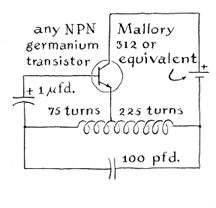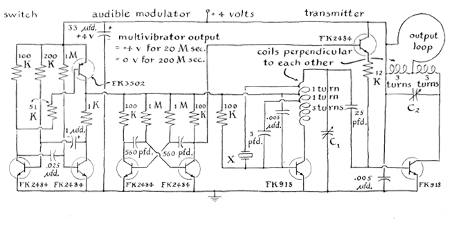 Take these receivers outside the building. In large cities some of the receivers will pick up several interfering broadcasting stations at the same time. Buy the one that is most selective. Usually little correlation is found between size, price and quality. Many experiments can be conducted in which the receiver is within two or three feet of the transmitter. In such experiments signals of adequate strength are picked up by the antenna built into the receiver. Depending on the physical arrangement of the experiment, however, it may be desirable to equip the receiver with a loop antenna consisting of one or more turns of wire connected to the input terminals of the set. When one is making studies of caged animals, for example, a loop antenna can be installed inside the cage, or below it if the bottom of the cage is made of insulating material. Occasionally the experimenter may be interested only in the location of a free-ranging animal-for example such burrowing animals as gophers and moles. Here wires can be stretched over the ground in an even pattern that will ensure a wire's being near the animal at all times, so that a clear signal is consistently obtained. (It is not difficult to improvise a small, comfortable harness for attaching the transmitter to a captured animal that is then released.) To pinpoint the position of a transmitter within a given area the experimenter can stretch insulated wires in the form of slender, hairpin loops that form a pattern of crossed grids over the area. The loops should be about two feet wide; they can be hundreds of feet long. A transmitter that is within a foot or so of the intersection of two loops will generate a clear signal in each one. The observer pinpoints the location of the transmitter by connecting the receiver to each of the loops in sequence. The connections can be made by hand or, preferably, with an automatic switching mechanism. Large animals that range over many square miles are tracked by transmitters more powerful than those that send out conventional radio signals. The frequency of these transmitters should be controlled by quartz crystals. The accompanying illustration [Figure 7] shows the circuit of a transmitter that has an effective range of several miles. The quartz crystal, which is designated X in the illustration, determines the frequency of the radiation.