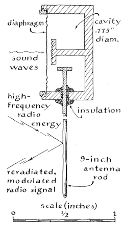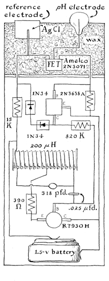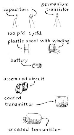 Highly directional antennas that resemble television receiving antennas can be used to follow an animal that carries a transmitter of this type. Two such antennas, spaced a known distance apart, are turned to the direction from which the signal is loudest. The position of the animal with respect to the observer is then calculated by triangulation A number of legal considerations must be observed by experimenters who operate radio transmitters of any kind or size. The regulations are altered from time to time, so that it is not possible to summarize them here. Information about them can be obtained from Ben F. Waple, Secretary, Federal Communications Commission, Washington, D.C. 20554. Sensors of many kinds can be built into transmitters. Their variety is suggested by two examples. One unit, which can be made small enough to pass through the gastrointestinal tract of some large animals, measures and transmits pH-the relative acidity or alkalinity of surrounding fluids. The active sensing elements of the device include a small but otherwise conventional glass electrode and a silver chloride reference electrode. Potentials developed across the electrodes are amplified by an electrometer circuit that employs a field-effect transistor. The output of the electrometer modulates the transmitter. This device is somewhat complex and not easy to construct. At the opposite extreme is a transmitter that senses sound. Requiring no battery, it is powered by an external transmitter. Radio energy picked up by the antenna enters a small metallic cavity that is tuned, much like an organ pipe, to resonate at the frequency of a selected beam of radio waves. Sound waves that impinge on the thin metallic diaphragm closing the cavity cause the diaphragm to vibrate and thus alter the natural resonant frequency of the cavity. This change, in turn, alters the strength of the signal that is reradiated by the antenna. Devices of this kind that need no local source of energy are known as passive transmitters. Sounds that are within the transmission range of the reradiated signal can be heard in a radio receiver. A minute transmitter of this type, with an impressive transmission range, made international news in 1960 when Ambassador Henry Cabot Lodge reported to the United Nations its discovery in a wall hanging of a U.S. embassy. My experiments have been made mostly with transmitters of the Hartley type. I have had only one brush with failure, but even this experiment turned out well. With the cooperation of a local veterinarian, I fed a temperature-sensing transmitter to my dog. The animal emitted gratifying clicks for two days, and I started to draw a graph of variations in temperature along his gastrointestinal tract. On the third day the transmissions mysteriously ceased. I immediately assumed that the transmitter had failed. Later, however, I went around my yard carrying my receiver. In a far corner of the front lawn the signals came in loud and clear!