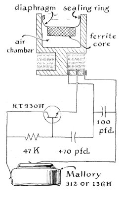For the quickest response to changes in temperature the thermistor is mounted either on the surface of the transmitter or externally as a separate unit. The transmitter can be made responsive to changes in pressure by suspending close to one end of the coil a piece of magnetic material, such as a thin disk of ferrite. The disk is supported by a flexible diaphragm [see above] The disk can be sawed from the end of a cylindrical "loop stick." Such sticks are available from dealers in radio supplies. The diaphragm can be cut from any thin sheet of plastic (such as Saran Wrap) that is relatively impermeable and assembled in the cavity of a coil form machined from a plastic rod. Increases in the pressure of a fluid in which the transmitter is immersed move the ferrite disk toward the coil, thus increasing the inductance of the coil and lowering the frequency of the radiated signal. The inward motion of the diaphragm also compresses the trapped air, creating a restoring force that moves the ferrite away from the coil when the external pressure falls. Changes in pressure are sensed by the receiver as changes in frequency of the radiated signal. The tuning dial of the receiver can be calibrated accordingly. The transmitter, when so constructed, can be used simultaneously for telemetering both temperature and pressure. Although almost any radio receiver will pick up the signals, some receivers work better than others. The best ones must be found by trial. Take a transmitter into a radio store and try it on an assortment of receivers. Select for additional test those receivers that tune most sharply and appear to be most sensitive.
