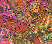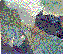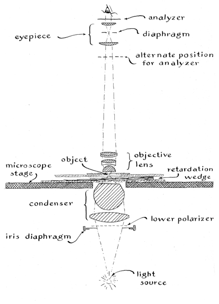 These specimens include textiles and the fossils of marine plants such as diatoms. When a specimen of fine silk is examined under three-color Rheinberg illumination, the warp appears in one color and the woof in another; both appear against the background of the third color. The colors can be blended and interchanged by rotating the specimen. "Color filters for Rheinberg illumination can be made by cutting the central disks and the surrounding rings from thin sheets of colored plastic and cementing them with Canada balsam to disks of clear glass that fit into the filter holder of the instrument. For best results the edges of adjacent colors should be covered by an opaque border about three millimeters wide. The border can consist of a ring of black paper cemented directly to the filters. The accompanying photomicrographs [top] illustrate some effects of combining two and three colors. Most of my photomicrographs are made with a Nikon S-Ke microscope and a Nikon EFM Microflex camera. "Images so colored do not correspond perfectly to the actual appearance of the object under examination. The same situation is more or less true of all microscope images. Complete correspondence between the object and its image can be approached but not attained because light from a point comes to a focus as a small disk of finite size. Disks resulting from closely spaced points merge into a fuzzy spot. Moreover, all the light from a point would be required for the formation of a perfect image of the point, whereas only a small portion of the emitted light ever reaches the image. Most of the light is scattered in other directions. For such reasons the microscopist must judge the true nature of the object by examining the image while taking account of the techniques that were used to create it. Color, when employed in this sense, becomes a powerful aid for isolating individual details in specimens. "Although Rheinberg illumination increases the visibility of specimens that have physically distinct parts, it is of less use for examining the fine, transparent features of rocks, crystals and plant fibers and of no use for detecting patterns of stress in glass and other amorphous substances. Many of these materials, however, have an optical property of great value to the microscopist. They rotate the plane in which light waves vibrate. This property can be used for creating color in many features of otherwise clear and transparent materials.