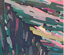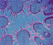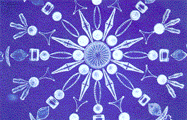 "What I have described is a simple version of Rheinberg illumination. Full Rheinberg illumination is established by installing a colored filter in the form of a ring in the clear space between the colored stop and the edge of the filter holder. When complementary hues are selected for the colored stop and the surrounding annulus, the specimen appears in one color against a background of contrasting color. Effective combinations are red against green and blue against yellow. A third color can be introduced by dividing the annulus into four equal parts and installing contrasting colors in adjacent sectors-red, say, in one pair of opposite quadrants and green in the other pair. The colored stop, which might be dark blue, provides the third color [see Figure 10]. "The colored field is lighted by the solid cone of direct rays from the colored stop, whereas the image is formed by annular rays of lesser intensity that are scattered into the objective by diffraction. If the two Rheinberg filters are equal in density, the rather dim image of the specimen may be lost in the brilliant background. The relative intensity can be adjusted in several ways. The density of the colored stop can be increased by means of multiple layers of colored plastic. Alternatively, a neutral-density filter can be combined with the colored plastic. I cut such filters from a piece of developed negative film that has been exposed in a camera to a sheet of white paper. The density of the negative is controlled by the exposure. "The brightness of the background color can be made continuously variable by the use of two Polaroid filters. The filters transmit waves of light that vibrate in a single plane but absorb waves that vibrate in other planes. A filter consists of a plastic sheet in which needle-like crystals of iodoquinine are embedded. They all point in a single direction, like the pickets of a fence. Light waves that vibrate in a plane parallel to the crystals are transmitted by the Polaroid. Waves that vibrate in other directions are increasingly absorbed by the filter as the plane of vibration departs from the direction in which the crystals point. "Light that makes its way through one sheet of Polaroid will be transmitted by a second sheet turned so that the crystals of both sheets are parallel. Conversely, the second sheet will largely absorb light transmitted by the first if its crystals make a right angle with respect to those in the first sheet. By placing one Polaroid filter in the central stop of the Rheinberg filter and a second one in or on the eyepiece of the microscope, the brilliance of the background can be controlled by rotating the upper Polaroid filter. Polaroid filters, sheets of plastic in assorted colors (for making Rheinberg filters), clear disks of glass, Canada balsam and related supplies for the microscope are available from the Edmund Scientific Co., Barrington, N.J. 08007. "Three-color Rheinberg illumination is particularly effective for examining specimens that display recurring features.
