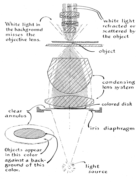 "Kohler illumination is established by a series of simple adjustments. Move the body tube up or down until the specimen appears in sharp focus. Partly close the diaphragm of the lamp and move the substage condenser up or down until a sharp image of the diaphragm appears in the plane of the specimen, as viewed through the eyepiece. Center the light by moving the lamp or mirror. "Enlarge the diameter of the disk of light by opening the lamp diaphragm until its edge just disappears from view. Remove the eyepiece, observe the spot of light that appears in the rear lens of the objective and close the iris diaphragm of the substage condenser until the diameter of the spot appears to be about three-quarters of the diameter of the rear lens. Replace the eyepiece and examine the specimen. It will appear against a bright background. Most details will seem darker than the background, but (depending on the nature of the specimen) some may seem brighter. In general the brightness of the background will be uniform. "The microscope has now been adjusted for 'bright field' work. The term refers to a form of lighting that is useful for making photomicrographs of stained specimens in black and white or color. The tenuous structures of some specimens, however, are difficult to see against the bright background. Many of the structures can be brought into view by a simple modification of Kohler illumination. The effect of the change is to reverse the character of the scene: the image appears bright against a dark background. "This effect can be achieved by blocking the solid cone of rays that normally enters the objective lens and illuminating the specimen with the surrounding hollow cone of rays that remains. The solid cone is blocked by putting an opaque disk of appropriate diameter in the center of the substage iris diaphragm, which is just below the condensing lenses. The opaque disk can be cut from black paper. It is cemented to a disk of clear glass that fits into the filter holder of the instrument's substage.