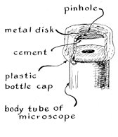 "The unobstructed circular space that remains between the edge of the opaque disk and the edge of the filter holder transmits a hollow cone of light through the condenser. The light illuminates the specimen with oblique rays that miss the objective lens. None of the rays reach the eye directly. The field appears dark. Features of the specimen, however, diffract, or scatter, light from the hollow cone. Some of the rays enter the objective lens. They are brought to focus at the eye in the form of a bright image that appears against the dark background. Minute details that are easily overlooked in a bright field stand out clearly against the dark field in an image of high visibility. "To prepare an opaque disk of the right size for dark-field work, adjust the instrument for Kohler illumination. Remove the eyepiece and replace it with a pinhole aperture. The pinhole, which should be about a millimeter in diameter, can be made in a thin sheet of black cardboard or metal that is painted flat black. The hole must be centered on the axis of the body tube. It can be supported in this position by an opaque bottle cap that fits snugly into the body tube. A larger hole is cut in the center of the cap to expose the pinhole [below left]. "With the pinhole in place and Kohler illumination established, look through the pinhole and close the iris of the condenser until the edge of the iris barely cuts into the field of view. Open the iris until its edge just disappears. Measure the diameter of the opening of the substage iris diaphragm at this adjustment An opaque disk about 5 percent larger in diameter will, when it is placed in the substage filter holder, block all direct rays to the objective lens and result in dark-field illumination. "Although dark-field illumination reveals many features of specimens that cannot be seen clearly against a bright field, visibility can be increased still more by introducing color into the image. The background can be made to appear in color by substituting a transparent colored disk for the opaque disk. Specimens then scatter white light into the objective and appear bright against a background of the selected color [see Figure 7].