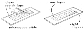 "The technique requires only two accessories: a pair of Polaroid filters and a retardation step wedge, which consists of a series of progressively shorter strips of Scotch tape applied to a microscope slide [left]. The material to be examined is placed on the slide of the microscope, lighted by the Kohler technique and focused. A Polaroid filter is placed in the filter holder below the substage condenser. The second Polaroid filter, which is called the analyzer, can be placed on top of the eyepiece and supported in that position by a holder made from an opaque bottle cap. The analyzer can also be put in a holder attached to the front end of the eyepiece. When the analyzer is rotated, the brightness of the background will vary from a maximum to a minimum twice during each revolution. The brightness of details in the specimen will vary similarly and some may appear in color. "If the retardation step wedge is now inserted under the specimen in a position that admits light through two thicknesses of Scotch tape, the image will be seen as a spectacular pattern of hues that span the spectrum. The various colors can be made to blend, to shift from one detail of the specimen to another and to change in saturation by rotating the wedge with respect to the optical axis of the microscope. Rotate only the wedge, not the specimen slide. The insertion of the wedge will move the specimen and throw the image out of focus. The instrument should be refocused each time the position of the wedge is changed. The saturation of the colors can be decreased from vivid hues to pale pastels by advancing the wedge so that the light passes through several additional layers of Scotch tape. "More pleasing colors and images of improved resolution can be produced by substituting thin sheets of mica for Scotch tape. The sheets can be split from a block of mica by thrusting the point of a sewing needle into the edge of the block. The optimum thickness of the sheets must be determined experimentally but will be about .003 inch. Split off a sheet about the thickness of tissue paper and try it on the stage of the microscope. If the colors are brighter than those that appear when Scotch tape is used, cut the sheet into strips and make the wedge. If the colors are not brighter, try thinner or thicker sheets. "Some transparent materials fail to show color when they are examined by this technique. Indeed, nonopaque solids can be divided into two groups according to how they appear when they are examined between a pair of Polaroid filters that are rotated to the 'crossed' position at which they transmit minimum light. One of the two groups consists of substances that do not rotate the plane in which light vibrates. Such substances, which are described as being optically isotropic, remain dark when viewed between the filters; an example is ordinary table salt. The second group consists of substances that do rotate the plane of polarization. Called anisotropic substances, they include such readily available chemicals as potassium chlorate, oxalic acid, calcium carbonate, boric acid, salol and DDT. Many plant fibers, most transparent plastics, thin sections of rock and also glass that has been heated until it is soft and cooled without annealing are anisotropic.