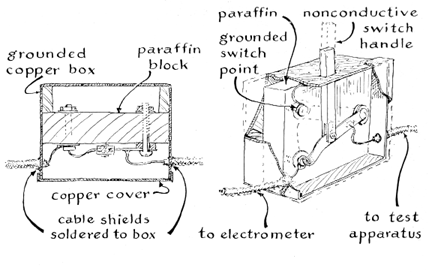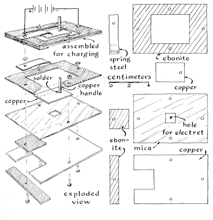 "My electrets are rectangular, 10 millimeters square. They range in thickness from a fraction of a millimeter to five millimeters. They are formed within a rectangular perforation 10 millimeters square cut in a sheet of mica; they remain permanently attached to the mica at the edges. The mica serves as a mechanical support and a convenient fixture for handling the charged dielectric. A sheet of stiff plastic, such as Formica, could be substituted for the mica. Mica is convenient for investigating thin electrets, however, because it can be split easily into sheets of any desired thickness. "When making wax electrets, I lay the mica over a small rectangle of tinfoil placed so that the foil is covered by the rectangular perforation, thus forming a small container with mica sides and a foil bottom. The melted wax is poured into the container and covered by pressing a second sheet of tinfoil on top. The upper and lower foils remain attached when the wax solidifies; they serve as electrodes. Electrets made of plastic such as Plexiglas, nylon and Teflon are formed in much the same way. Plastic in square sheets piled to the desired thickness is placed in the container, covered with tinfoil and pressed while being heated in an oven and during subsequent cooling. "A simple fixture was improvised for holding and simultaneously pressing thin electrets during fabrication. The fixture consists of a multilayered sandwich of copper and ebonite fastened together at the edges by four machine screws [see Figure 1]. I made the bottom layer out of flat sheet copper 50 millimeters wide, 75 millimeters long and two millimeters thick. The lower electrode of tinfoil is placed on top of the copper at the center. The sheet of perforated mica, which is also 50 millimeters wide and 75 millimeters long, is placed on top of the tinfoil and the copper.