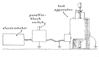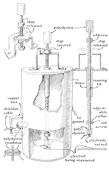 "Polarizing potential is applied to the fixture by a pair of leads that are insulated by a covering of asbestos. Wire of this type is commonly used in household appliances such as toasters and is available from dealers in electrical supplies. The polarizing energy must be provided by a direct-current source. I use dry batteries. "A power supply could be improvised by rectifying and filtering the output of a step-up transformer. The rectifier can consist of a 1B3 diode connected in series with one output lead of the transformer. The filament of the diode can be heated by a 1.5-volt dry cell connected in series with a 1/4-ohm, one-watt resistor. The anode of the tube should be connected to the output lead of the transformer. Adequate filtering can be provided by connecting a high-voltage capacitor of the 'cartwheel' type (commonly used in television sets) to the remaining grounded lead of the transformer and the filament of the tube. "To control the output voltage connect a string of 12 one-watt resistors of one megohm each across the capacitor. Connect the grounded side of the power supply to the copper plate of the electret fixture and with an alligator clip connect the top electrode of the fixture to a resistor selected according to the voltage desired. A second capacitor of the same type connected across the leads to the electret would provide additional filtering. The maximum output voltage of the power supply will be equal to the voltage shown on the nameplate of the transformer multiplied by 1.414. The polarizing potential need not exceed 1,000 volts per millimeter of electret thickness, although it is interesting to compare the performance of electrets formed at higher and lower voltages. "A typical wax electret is formed by applying the polarizing potential and heating the fixture at constant temperature for three hours. The heat is then turned off. My oven cools to room temperature in six hours. I then switch off the power and short-circuit the leads to the electret. The tinfoil of the upper electrode is unfolded, the pressure plate is removed and the mica is lifted from the fixture with both foils intact. The electret is quickly short-circuited by wrapping a narrow strip of foil around the unit so that it makes contact with both electrodes. The foil electrodes should be removed only at the time of measuring the charge. In the case of very thin electrets the lower tin electrode should not be removed at all, otherwise the sample will come out of the mica perforation. "The charged electret cannot perform work. The device simply supports an electrostatic field. The electret can, however, be used for generating (by induction) electrical energy that can perform work. "To generate electrical energy in a brass disk, I connect the disk to ground and place it in contact with one surface of the electret. The other surface is grounded. Electrostatic force either drives electrons out of the disk and into the ground or attracts electrons from the ground into the disk, depending on the polarity of the electret's field. "I then break the ground connection to the disk, thereby preventing further displacement of the electrons, and lift the disk away from the electret. Work must be performed to separate the disk from the electret against the force of electrostatic attraction; energy thus stored in the disk can be expended to perform work. The amount of energy so generated varies with the strength of the electret and with the amount of the disk's separation from the electret. "I improvised an apparatus that consistently lifts the disk at a predetermined rate to a predetermined height. The amount of energy generated by this apparatus varies only with the charge on the electret. I measure the charge by connecting the output of the apparatus to an electrometer. "The apparatus consists of a cylindrical container that supports on its axis a movable rod of brass terminating in an insulated disk of brass [see Figure 4]. The rod is supported at any intermediate position by a pair of adjustable helical springs and is locked at the limit of its downward excursion by a latch. When the latch is operated, the springs lift the rod to its elevated position. "An electret to be tested is placed on the metal plate that forms the base of the apparatus; the position of the electret should be directly below the rod and its terminal disk. The rod is pushed down so that the disk makes contact with the surface of the electret; in this position the rod is latched. The external switch is operated to ground both the disk and the electret and is kept in this position for one minute to let the electret become electrically stabilize. The output of the apparatus is then switched to the electrometer and the latch is operated, thus transferring the surface charge of the electret to the disk by induction. The magnitude of the resulting pulse of energy, as indicated by the electrometer, is observed and tabulated. "The temperature at which electrets are formed influences the charge they acquire. The two accompanying graphs [Figures 5 and 6] depict the performance of six electrets made of 75 percent carnauba wax mixed with 25 percent beeswax Three of the units were .5 millimeter thick and three were one millimeter thick. All electrets were formed by a polarizing potential of 1,000 volts per millimeter of thickness. "In a typical case I adjusted the oven to a temperature of 80 degrees C. The fixture containing the dielectric was placed in the oven and voltage was applied. After three hours the heat was shut off. The oven cooled to room temperature in six hours. The high voltage was then turned off. Electrets were similarly prepared at 60 and 25 degrees C. "To store electrets I wrap a ribbon of tinfoil completely around the mica holder, cover both sides of the mica with a uniform layer of absorbent cotton and place the assembly between a pair of ebonite plates bound together by a rubber band. The units are stored in a desiccator contain