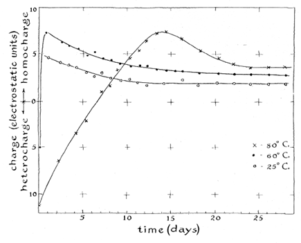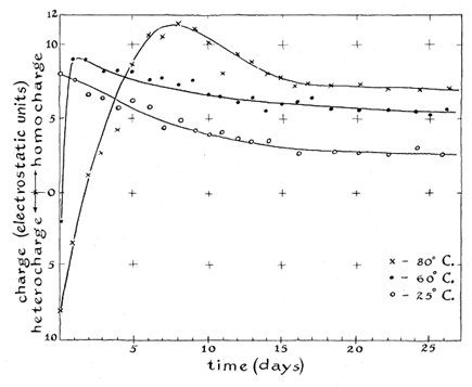 "The performance of an electret is determined by a number of factors including the material of which it is made, the temperature at which it is formed, the interval during which it is immersed in the electric field, the intensity of the field and the thickness of the dielectric material. The optimum combinations of these factors must be determined experimentally. "After Eguchi's experiments many investigators applied polarizing fields of the order of 1,000 volts per millimeter of electret thickness. More recently units have been formed with fields of lower intensity. Fields in excess of about 1,200 volts per millimeter do not increase the maximum charge retained by electrets. At the other extreme, electrets have been made in fields of only 10 volts per millimeter. "As Eguchi found, immediately after the electret is removed from the field the wax surfaces carry charges of a sign opposite to the sign of the adjacent electrodes. Wax in contact with the positive electrode acquires an initial negative charge and wax in contact with the negative electrode acquires a positive charge. Andrew Gemant of the University of Oxford has applied the term 'heterocharge' to the initial effect and 'homocharge' to the field of reversed polarity that appears after the heterocharge decays.