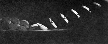 To make photographs by the repetitive-flash technique the room must be darkened and all background objects should be black. The shutter of the camera is opened. After the scene has been illuminated by a series of flashes the shutter is closed. The film is exposed during each flash and records a picture of the stone's position at that instant. "The lamp I used emitted flashes that lasted less than half a millionth of a second-about as long as it takes an automobile moving at 60 miles per hour to travel the thickness of its paint. For this reason the images of the stone in 1ight were sharp. "The stone reflects the light of only a single flash at each of its positions as it passes through the field of the camera. The background, however, reflects the light of all flashes. For this reason light reflected from the background must be kept low to prevent the film from being overexposed if the shutter is kept open for a half-second, the exposure I used. "Some photographs were made against a background of black velveteen, which reflects only about 1 percent of the light that strikes it. In other experiments I cleared an area of the background about 50 feet in depth. This had the effect of creating a black background because light reflected by 100 flashes from objects at a distance of 50 feet was not sufficient to expose the film significantly.