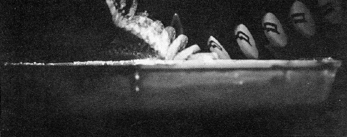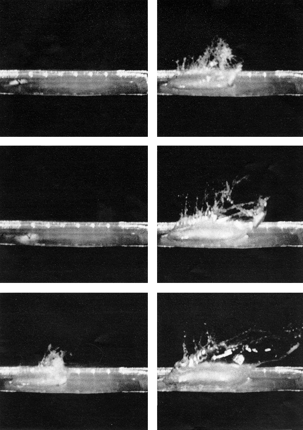 "The angular-momentum vector is determined by the direction of rotation, the angular-impulse vector by the edge that makes contact with the sand. Adding the two vectors, it is clear that a stone spinning in the clockwise direction and striking at the trailing edge will precess toward the right. Similarly, a stone that has counterclockwise rotation will precess toward the left. The gyroscopic effect thus produced is not great, however, because of the relatively low angular velocity with which the stone is thrown. "In many photographs the linear and angular velocities of the stone as well as the angle of approach were almost identical, but the angles of departure varied greatly. The angle of attitude was the only significant variable. Hence I concluded that the angle of departure in the case of stones skipped on sand must be a function of the angle of attitude. "The repetitive-flash technique did not work well in the case of stones skipped on water. Splashes obscured the details at the moment of impact. I therefore substituted a high-speed motion-picture camera for the stroboscopic flash and filmed the events at 600 frames per second at an aperture of f/2. The pictures were taken from the side at a distance of 12 feet and from a point slightly above the horizontal. The analysis was made by printing key frames of the film as still photographs [see Figure 7]. "The photographs show that a stone skipped on water does not react like one skipped on sand. When a stone is thrown at an angle of about 20 degrees, the trailing edge makes contact first. The stone planes along the surface of the water and then tilts backward to an attitude of approximately 75 degrees. A crest of water builds up in front. The stone now lifts out of the water and makes a long hop. The entire interaction of the stone and the water is quite complex, so that it may be possible to throw a stone of some other shape in some way that would cause it to make a double hop, as Wright suggested. All the stones I threw, however, made single impacts followed by long leaps." Music is often spoken of as though it were a branch of thermodynamics. Louis Armstrong is said to blow the hottest trumpet, and Herb Alpert has the reputation of conducting the coolest brass group. Anyone who wants to put such observations to a literal test can do so by means of techniques that measure music in terms of heat. George R. Stibitz of the Dartmouth Medical School has developed an apparatus that transforms sound into heat and measures the resulting temperature with a thermometer. Stibitz writes: