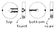 "A stone of irregular shape could not be skipped reproducibly, so I made symmetrical disks of sandstone in a range of diameters. The technique involved grinding a rough stone into a fiat slab with parallel surfaces and then grinding the edges to make a perfect disk. I used an ordinary grinding wheel to make the slabs. "A small hole was bored through the middle of the slabs with a cement drill. A bolt placed through the hole served as a mandrel for locking the Rat stone in the chuck of an electric drill. The irregular edges of each slab were then ground into a true circle by holding the spinning stone against the grinding wheel. Finally, I painted the stones white so that they would photograph easily. "I then applied a pair of black stripes that extended from the hole to the edge on one side. On the other side I painted a single stripe from the hole to the opposite edge [see Figure 4]. This distinctive pattern of markings made it easier to determine the orientation of the stone in photographs made during its flight. Other apparatus used in the experiments included a microphone, an amplifier, an oscilloscope, a stroboscope, a still camera and a high-speed motion-picture camera.