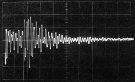 "I was not familiar with the best way to photograph a skipped stone. I did not know whether it would indeed make two closely spaced impacts as Wright had predicted. My first experiment was made to learn something about the velocity so that I could adjust the stroboscope to the optimum flash rate. "I placed the microphone close to the tabletop and adjusted the oscilloscope to begin a horizontal sweep at the instant the microphone picked up sound above a predetermined volume. The spot of light that appears on the face of the oscilloscope tube was adjusted to sweep from left to right at the rate of five milliseconds per centimeter. The intensity of sounds was indicated by vertical excursions of the spot. "The stone in skipping on the cloth-covered table definitely made two closely spaced impacts as indicated by the oscilloscope. The recorded pattern [below left] shows that the vertical excursions reach maximum amplitude twice near the beginning of the sweep. The sweep does not start until the sound of the first impact approaches maximum amplitude. For this reason only the final portion of the first impact is displayed. The interval between the two impacts spanned roughly .01 second, indicating that a minimum of 150 to 200 flashes per second would be required to record the path and orientation of the stone between impacts.