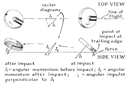 "The behavior of the stone was determined by analyzing the photographs. The center of mass of the stone was marked with ink on each recorded image. Then the centers of mass of the three images immediately before impact were connected by a straight line, with allowance made for the natural parabolic trajectory of the stone. The angle made by this line and the horizontal was measured and recorded as the angle of approach. The angle of departure was similarly determined and recorded. The tilt of the stone-its angle of attitude prior to impact-was determined by measuring the angle of the image that immediately preceded the stone's contact with the sand. "Normally a stone makes initial contact at the trailing edge and then strikes on the leading edge; a short hop results. The initial impact, which makes the first mark in the sand, exerts a torque that causes the stone to topple forward and strike the sand at the leading edge, where it makes the second mark. Then, depending on the angle of approach, the angle of attitude and the uniformity of the surface, the stone will either continue to topple or will right itself. Following the double impact, the stone makes a long hop. "Stones that make initial contact with the sand at the leading edge behave in essentially the same way if they skip at all; usually a stone that strikes first on its leading edge will dig into the sand and come to rest If it skips, the sequence is as follows. The leading edge lifts from the sand. The trailing edge then makes contact at or very close to the point of impact of the leading edge. Only one mark is made in the sand before the long hop. "The lateral displacement of alternate marks made by a skipping stone in the sand arises from the rotation of the stone about its axis. The spinning edge exerts a sideways force on the sand as it makes impact. The sand in turn deflects the stone to the right or the left depending on the stone's direction of rotation and on which edge hits first, the leading and trailing edges having oppositely directed velocity vectors. "Still another motion is evident in the photographs. When the tumbling force of the torque that is exerted on the stone by impact with the sand is imposed on the spin imparted by the throw, the stone begins to precess, or wobble, like a spinning top that is pushed from the vertical. In this respect the spinning stone is like a small gyroscope.