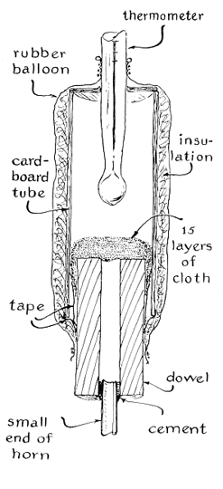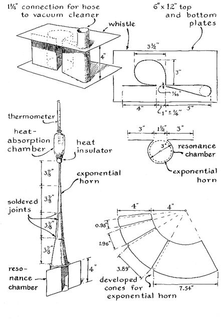 "It is no startling pronouncement to say that sound is a form of energy or that sound turns into heat when it is absorbed. Those who regard the term 'hot music' as nothing more than a colloquialism, however, might be surprised to watch a thermometer rise above the boiling point of water in response to the absorption of sound by a piece of cloth. "Any object as large as a thermometer radiates an appreciable quantity of energy, particularly at temperatures above 100 degrees Fahrenheit. To raise its temperature above that level requires a fairly powerful sound. A big loudspeaker could radiate sufficient energy, but I turned to a different source of sound for my apparatus. I designed a powerful whistle, which is shaped like the ones used by traffic policemen but is considerably larger. "The whistle, which is blown by the exhaust of a vacuum cleaner, was made by bending a strip of sheet metal 26 inches long and four inches wide into the shape of a jet directed across the mouth of a cavity. I then soldered end plates to the sides of the bent strip [see Figure 8]. "The whistle radiates sound in all directions, but the loudest sound comes from the opening of the cavity. In order to concentrate the acoustic energy and direct it into an absorbing chamber I constructed a crude horn of the exponential type. It picks up sound waves over an area of 10 square inches and directs them (through an opening of 1/20 square inch) into the absorbing chamber. The whistle and the horn were designed to generate a sound at about 528 cycles per second, one octave above middle C. Unfortunately the human ear is very sensitive to that frequency. A lower pitch would have been more comfortable during my experiments but would have required a larger whistle and horn. "Essentially the horn is analogous to an electrical transformer. It matches the acoustic impedance of the region in the vicinity of the whistle (about one acoustic ohm) to the impedance of the absorption chamber (100 acoustic ohms). The horn is not truly exponential, but it approximates this form by a series of conical sections four inches long with ends that have a ratio of 2:1 in diameter. The large end of the horn terminates in a cylindrical resonance chamber about three inches in diameter and four inches long. The chamber contains a rectangular opening 15 inches wide and four inches long flanked by a pair of Hat wings three inches wide. The end plates of the whistle are placed close to the wings of the resonance chamber for coupling the source to the load. "The absorption chamber was designed not only to transform sound energy into heat energy but also to prevent the loss of heat. The body of the chamber is a cylinder of cardboard (cut from a mailing tube) about 1 3/4 inches in diameter and three inches long [see illustration at right]. The cylinder is coupled to the small end of the exponential horn by a short bushing of wood. The low thermal conductance of the wood keeps heat from flowing rapidly into the metal horn. "I made the bushing of wood dowel by drilling a 1/4-inch hole through the axis. With a little filing the bushing made a snug fit with the end of the horn. The bushing must be cemented to the horn to make an airtight joint. A remarkable amount of acoustic energy can escape through even a few pinholes at the small end of the horn. "The absorption material consists of a pad of finely woven cloth. It covers the inner end of the wood bushing. The thickness of the cloth pad must be adjusted by trial and error for maximum performance. I found 15 layers of dress-lining material about right. "The cloth pad is held in place by masking tape. The mailing tube must also be cemented or taped to the dowel. In addition the tube must be insulated with a layer of absorbent cotton or glass wool and covered with sheet rubber of the kind used in rubber balloons. The rubber sheet prevents a steady flow of air from the horn and so minimizes the loss of heat by convection. "A candy thermometer makes a convenient indicator; an oven thermometer will work as well. Insert the thermometer through a hole in the rubber sheet. Then tie the rubber tightly around the thermometer to prevent the escape of air from the chamber. "When the operating whistle is brought close to the resonance chamber of the horn, the thermometer should rise 40 or 50 degrees F. after a few minutes of warm-up. The results will depend critically on the relative positions of the horn and the whistle. Another important factor is the acoustic resistance of the cloth pad. "The apparatus can be modified in a number of ways. For example, a wad of absorbent cotton placed in the hole of the bushing makes an efficient converter, but it is difficult to adjust. The acoustic resistance of the wad must come close to matching the impedance of the horn. The resistance changes greatly with comparatively small changes in the density of the cotton. The density of the cotton is determined, of course, by the pressure with which it is pushed into the dowel. "A more efficient design can be made by constructing the whistle and horn as a unit, but the adjustment of the coupling between the whistle and the resonance chamber then becomes difficult. My most efficient design created a temperature of 250 degrees F. The model described can easily be adjusted to create temperatures of 130 degrees. I have found that a space of 3/4 inch between the opening of the whistle and that of the resonator works well, depending on the pressure created by the vacuum cleaner, the shape of the whistle and the effectiveness of the pad in the absorption chamber. "An interesting experiment consists in measuring the amount of power that is converted from sound to heat. The experiment can be done by inserting a small tube of water in the thermometer hole and measuring its rise in temperature. A rise of one degree centigrade per milliliter of distilled water is equal to one calorie, or 4.2 watt-seconds. "The power delivered by the stream of air can al