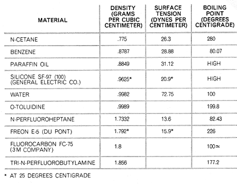 "In making the structures I use clear glass dishes of various sizes, including beakers, graduated cylinders and tubes. To prevent evaporation all the containers can be closed, preferably by ground-glass covers or ground-glass stoppers. Lipless beakers and crystallizing dishes with covers are ideal. The various liquids are added to the containers by means of pipettes or, in some cases, by disposable hypodermic syringes with a capacity of two to 10 cubic centimeters. "For preparing solutions I prefer freshly distilled water. Tap water usually contains air that in time comes out of solution and is deposited on the walls of the container as small bubbles. The bubbles obscure the contents of the container. Moreover, when they break free and rise, they set up currents that may disturb the structures. In addition, tap water may contain dissolved substances that react chemically with the liquids. When tap water is used, it should first be boiled and cooled to drive out dissolved gases. "Some of the chemicals I have used are listed in the accompanying table [Figure 10], together with their density (at room temperature), surface tension and normal boiling point. In general these materials are available from distributors of chemicals, such as the Fisher Scientific Company, Springfield, N.J. 07081. Exceptions include n-cetane, which can be obtained from the Phillips Petroleum Company; silicone oil, from the General Electric Company, Silicone Products Department; fluorocarbon wetting agent FC-128 and other fluorocarbon preparations, from the 3M Company; Freon materials and oil-soluble dyes, from E. I. du Pont de Nemours and Company. The materials are listed in order of increasing density. Those at the top of the list will float on those below and, in general, will not mix appreciably with near neighbors.
