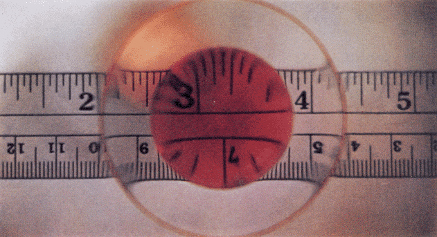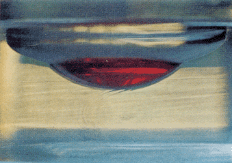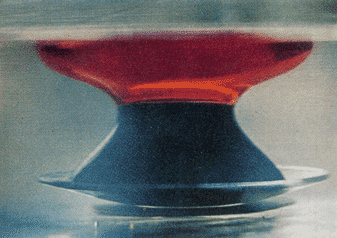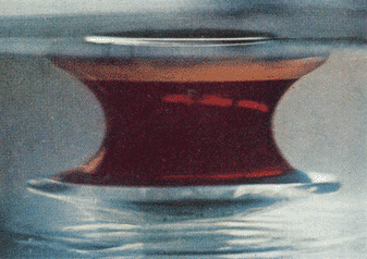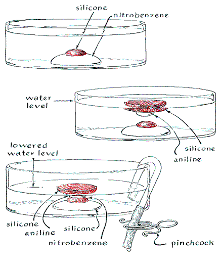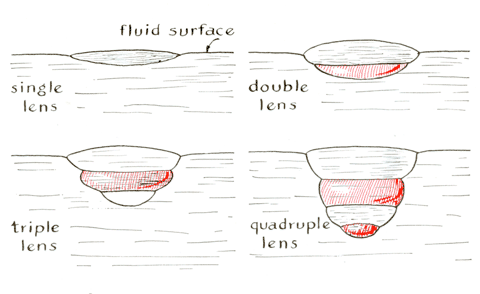 "Add a lens of paraffin oil to a container of water by placing the tip of an oil-filled pipette in contact with the surface near the center of the container and letting the oil flow into a patch about four centimeters in diameter. Add to the water three or four drops of wetting agent (Kodak Photo-Flow 200). With a clean pipette apply o-toluidine to the center of the paraffin oil. The o-toluidine will migrate through the oil lens and form a suspended meniscus that adheres to the lower surface of the paraffin oil. The optical properties of the combination (acting as a lens) can be judged by the accompanying photograph [Figure 5]. "A triple lens can be formed by substituting two milliliters of silicone oil for paraffin oil. To the solution add three drops of a 2 percent (by weight) aqueous solution of FC-128 wetting agent. One milliliter of o-toluidine is added to the bottom of the silicone. The third lens is then made by allowing a few drops of Freon E-5 to migrate through the assembly and form a crescent on the bottom surface of the o-toluidine. If desired, the Freon can be colored blue by mixing in a small quantity of fluorocarbon dye, Type L-1802, which is obtainable from the 3M Company. "A quadruple lens is built up by a similar procedure. First a double lens is made with two milliliters of paraffin oil and 1.5 milliliters of silicone oil, after adding 10 drops of FC-128 wetting agent to the water. The third lens consists of .8 milliliter of o-toluidine. I stained this lens pink so that its boundaries could be examined easily. The fourth lens was made of .15 milliliter of Freon E-5 dyed blue [below].