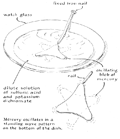 meaning that it weighs more per unit volume. The dinner-table performer takes this fact into account before doing the trick and stealthily mixes three spoonfuls of sugar into the coffee, thus making the coffee denser than the cream. Altering the surface tension of a liquid can also lead to interesting effects. Surface tension arises from attraction between the molecules of a liquid and explains in part why some liquids refuse to mix with others. For example, molecules of mercury are so strongly attracted to one another that they literally squeeze out molecules of water or other substances that do not readily mix with mercury. A particularly fascinating effect that accompanies a change in surface tension can be demonstrated with an iron nail and a small pool of mercury that is immersed in an electrolyte. The mercury is placed in a shallow container with a spherical bottom, such as a large watch glass, and flooded with about 30 milliliters of tap water. To the water is added four drops of sulfuric acid and about three milligrams of potassium dichromate. (A dozen particles of potassium dichromate about the size of sugar granules approximate this weight.) A clean iron nail, free of rust, is placed in the solution with the point directed toward the center of the container and the head of the nail overhanging the edge [see Figure 6 ]. Push the nail slowly toward the center of the watch glass until the point makes contact with the mercury. The mercury will immediately dart away from the nail, return, make contact and repeat the performance again and again. Depending on the amount of mercury and the position of the nail, the oscillation will assume an ever changing pattern of amoeba-like forms. If the pool contains 40 grams of mercury. the nail can be shifted by trial and error into a position at which the mercury oscillates as a standing wave with three crests and three valleys, as illustrated. The action will continue for half an hour or longer, until most of the potassium dichromate combines chemically with the mercury. The apparatus functions as a voltaic cell in which the mercury and the iron serve as electrodes. Current generated by the cell periodically alters the intermolecular attraction of the mercury that accounts for its surface tension. The variations, which are in effect pulses of force, induce the vibration. The behavior of liquids that float on or within other liquids without much mixing has in recent years attracted the interest of Aristid V. Grosse, president of the Research Institute of Temple University. Grosse and his associates specialize in research at high temperatures. In the course of this work the need arose for a container that could be heated above the melting point of any known substance. Ultimately they devised one: a crucible made of liquid! The furnace that heats the crucible consists essentially of a horizontal, rotating cylinder of metallic oxide exposed on the inside to a plasma jet that develops a temperature close to 30,000 degrees Fahrenheit. The inner surface of the oxide melts; the resulting fluid is held against the rotating shell of solid oxide by centrifugal force. The liquid metal of interest floats on the molten oxide without mixing. (Carbides, nitrides and other metallic compounds can also be used.) "In the course of these experiments," Grosse writes, "it became apparent that many facts about immiscible or partly miscible liquids had never been investigated. Since experimentation is much easier at room temperature than at high temperature, I decided to study the behavior of a liquid lens of gallium floating on mercury-the simplest case of two immiscible metals that can exist in the liquid phase at room temperature. Gallium is a rare and costly metal, however, a fact that seriously restricted the scope of the experiments. "For this reason it became apparent that the investigation could be extended only by substituting selected organic and inorganic liquids for the metals. Experiment soon demonstrated that such substances worked nicely-so nicely that I found myself tinkering with them at home. Thus was born my new hobby: making liquid structures. The structures include double lenses, triple lenses and poly-lenses that float on and in water; 'weightless' lenses and other forms that I suspend between solutions, and multiple-layered pillars that stand in liquid. It is also possible to make such structures as enclosures and walls. "The variety of structures that can be made appears to be limitless. Some combinations behave in strange and unexpected ways. The forces that bind the liquids together still await thorough investigation. Here, then, is a hobby full of opportunity, one I am delighted to share with amateurs.