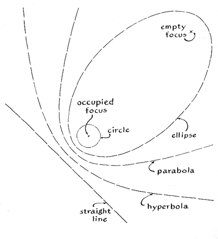 "In discussing the technique of predicting orbits I use one mathematical symbol that is not always taught in arithmetic courses. I substitute an exponent for the radical sign that is used customarily for indicating roots. For example, if a represents a number, the symbol a1/2 means 'the square root of a.' Thus if a = 9, then a1/2 = 3. Similarly, I use the fractional exponent to indicate the multiplication of a root by itself. The number of multiplications to be made-is indicated by the numerator of the exponent. For example, in absolute terms, if a = 9, then 91/2 x 91/2 x 91/2 = 93/2 = 3 x 3 x 3 = 27. Again, if a = 4, then a3/2 = 8. Incidentally, much of the pain of extracting a square root can be avoided by using a six-place table of logarithms, and a desk calculating machine can take over the drudgery of doing multiplications and divisions. These, however, are merely laborsaving techniques. You get the same results with pencil and paper. "Thus equipped, you are set to proceed. All bodies travel in space along one or another of the familiar set of curves known as the conic sections: the circle, the ellipse, the parabola, the hyperbola and the straight line [see Figure 1]. Of these curves only two-the circle and the ellipse-form a closed path. Therefore satellites that orbit the earth or any other natural body must travel in one or the other of these paths. "If a satellite is given barely enough velocity to stay aloft, it will pass through all points on its orbit at its minimum altitude and its path will be a circle. The satellite is then said to have 'circular velocity.' If the satellite has somewhat more than this minimum velocity when it passes through its point of minimum altitude, the path will elongate into an ellipse that reaches maximum altitude at a point on the orbit directly opposite the point of minimum altitude. The satellite is then said to have an 'elliptical velocity.' "As more and more velocity is imparted to the satellite or any other space vehicle the ellipse expands until at one critical velocity it opens into a parabola. At this velocity the probe overcomes the gravitational attraction of the earth and plunges into space, never to return. It has achieved one of many possible 'escape velocities,' in this case 'parabolic velocity.' Should even more velocity be imparted to the probe, the path will bend into one of many possible shallower curves known collectively as the hyperbolas and will have 'hyperbolic velocity.' If it were possible for the probe to acquire infinite velocity, the hyperbolic path would flatten into a straight line, the final curve in the family of conic sections. "To compute the behavior of a satellite at any velocity we first need to know its parabolic velocity with respect to a selected body such as the earth. The selected body is known as the 'primary.' Initially, for the purpose of this discussion, we may assume an airless, nonrotating primary body. It turns out that parabolic velocity is the velocity an object would acquire by falling through a distance equal to the radius of the attracting primary body at a constant gravitational acceleration equal to the acceleration at its surface.