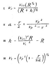 "For example, assume that a body is 400 miles above the surface of the earth at perigee and that its velocity at this point is 18,000 miles per hour. First determine the circular and parabolic velocities at a point 400 miles above the earth (h) using the procedures discussed above. The mean radius of the earth (R) is 3,958.8 miles. R + h is therefore 4,358.8 miles. The parabolic velocity comes out to 23,932 miles per hour. Its square is numerically equal to approximately 572,740,000, and the square of 18,000 miles per hour is 324,000,000. Their difference is 248,740,000. Using formula II, the semimajor axis (a) is equal to 4,358.8/2 x 572,740,000/248,740,000, or 5,012, miles. Doubling this length gives the length of the major axis (2a): 2 x 5,012, or 10,024, miles. The radius vector at apogee can now be found simply by subtracting the sum of the perigee radius vector plus the earth's radius, R + h, from the major axis: 10,024 - 3,958 + 400, or 5,666, miles at apogee. The altitude of the satellite at apogee is then found by subtracting the earth's radius from the radius vector at apogee: 5,666 - 3,958.8, or 1,707.2, miles. "It was Johannes Kepler who first pointed out that the product of the velocity of an orbiting body and its radius vector is constant at the apo-point and peri-point of the orbit, which means that if three of these quantities are known, the fourth can be determined. Stated symbolically, r1 x v1 = r2 x v2, in which r1 is the peri-radius vector, r2 is the apo-radius vector and v1 and v2 are the respective velocities at these points. If the altitude of an earth satellite at perigee is 400 miles, and the velocity at this point is 18,000 miles per hour, and if its altitude at apogee is 1,707.2 miles, what is its velocity at apogee? As calculated above, the corresponding radius vector at perigee is 4,358.8 miles (earth's radius of 3,958.8 + 400 miles) and the radius vector at apogee is 5,666 miles. Solving for the desired velocity at apogee is a simple matter of proportion: r1 x vl/r2 = v2 or, expressed numerically, 18,000 x 4,358.8/5,666,or l3,847, miles per hour. "These formulas are useful for solving other interesting problems. For example, if a body is on an elliptical orbit at an altitude of r miles at apogee and has a velocity of y miles per hour at this point, how much additional velocity must it acquire in order to leave the primary body? The answer is found by computing the parabolic velocity at r miles and subtracting the velocity at apogee. "At what altitude does 18,000 miles per hour become the parabolic velocity of an earth satellite? To find the answer divide 18,000 by the square root of 2. This gives the circular velocity. Insert the circular velocity in the equation for circular velocity. R, vc and vcs are known but R + h is unknown. To find h multiply the square of vc by R, divide the product by the square of vc and subtract R, as indicated symbolically by the accompanying formula [III in Figure 2]. "The same general formulas work in the case of interplanetary orbits, but for convenience distance is measured in terms of astronomical units (A.U.) instead of miles. Astronomers selected the average distance between the earth and the sun, some 93,000,000 miles, as the length of the astronomical unit. As an illustration of its use, consider the case of the planet Mercury. Mercury is about 3.6 x 107 miles from the sun, whereas the earth is about 9.3 x 107 miles from it. To put the matter another way, Mercury is 3.6/9.3, or 39 percent, of the earth's distance from the sun. Astronomers state that Mercury is .39 A.U. from the sun.