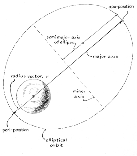 "One might consider the parabolic velocity of the earth. The average radius of the earth is 2.09029 x 107 feet. (The term 107 means that the decimal point of the preceding figure must be moved seven places to the right; the notation in this case is merely another way to write 20,902,900 feet.) The acceleration of the earth's gravity is 32.174 feet per second per second. The distance a body falls is equal to half of the product of the acceleration of gravity multiplied by the square of the time during which the body falls. The time of fall is equal to the square root of half of the product of the distance divided by the acceleration of gravity. In these conditions an object falling one earth radius would need a time of (1/2 x 2.09029 x 107/32.174)1/2, or 1,140.1, seconds. The velocity acquired by a body that falls through a known distance at a constant acceleration is equal to the acceleration of gravity multiplied by the time of fall, in this example 32.174 x 1,140.1, or approximately 36,680, feet per second. To convert the velocity into miles per second divide 36,680 by 5,280 (the number of feet in a mile) to get 6.945 miles per second. This, then, is the parabolic velocity of an earth satellite, the minimum velocity the object must have to escape from the earth's gravitational field. "What velocity must a satellite have to orbit the earth in a circular path? Interestingly enough, the circular velocity of an object orbiting any planet at any altitude is equal to the parabolic velocity at the altitude of interest divided by the square root of 2. Expressed in algebraic notation the formula is vc = vp/21/2, in which vc represents circular velocity and vp represents parabolic velocity. Using this formula in the case of an earth satellite, the circular velocity at sea level is equal to 36,680/1.42, or 25,830, feet per second. Transforming feet into miles yields 25,830/5,280, or 4.892, miles per second. A satellite could not orbit the earth at sea level, of course, because it would be burned up by friction with the air. Nevertheless, the figure is most useful for computing orbits at higher altitudes. "If we let vcs stand for the circular velocity of a satellite at the surface of the primary body, R for the radius of the primary body and h for the altitude of the satellite above the body, the circular velocity at the selected altitude is equal to vcs x R1/2/(R + h)l/2. When the circular velocity at the selected altitude has been determined, the parabolic velocity at the same altitude is computed simply by multiplying the circular velocity by the square root of 2. This figure is useful for determining the additional velocity that must be imparted to a deep-space probe to launch it from an orbiting vehicle. "What of orbits that are neither parabolas nor circles? Between these two limits lies the region of elliptical orbits [see Figure 3]. An ellipse is a closed curve with two focal points. The center of gravitational attraction always lies at one of these two foci. When a satellite is on an elliptical orbit around its primary body, the point of closest approach is known as the 'peri-position.' In the case of the earth this point is called the 'perigee,' in the case of the sun the 'perihelion,' in the case of an unspecified star the 'periastron' and so on. At its periposition the orbiting body is always traveling faster than the circular velocity but always traveling slower than the corresponding parabolic velocity. "A line drawn through the two foci of an ellipse so that it extends to the ellipse itself is known as the major axis of the ellipse. One-half of this length, extending from the center of the ellipse to either point of intersection with the curve, is called the semimajor axis, usually denoted by the letter a; the dimension is most useful for making orbital computations. Another important line can be drawn from the body that is in orbit to the center of its primary body. This line, which is called the radius vector, changes in length continuously if the orbit is an ellipse but remains constant in length if the orbit is a circle. "The semimajor axis of an ellipse can be computed easily if the parabolic velocity, the peri-position velocity and the peri-position radius vector of the orbiting body are known. It is equal to half of the peri-position radius vector multiplied by the quotient of the square of the parabolic velocity divided by the difference beetween the square of the parabolic velocity minus the square of the velocity at the peri-position, as shown symbolically by the accompanying equation [II in Figure 2], in which a stands for the semimajor axis, r for the peri-position radius vector, v for the velocity at the peri-position and vp for the parabolic velocity at that altitude.