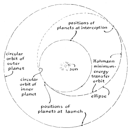 "With this unit in mind we can proceed to problems that involve 'minimum energy' probes. The term refers to the path a probe must follow if it is to consume the minimum amount of fuel. Suppose an orbiting earth satellite is to be sent to another planet, such as Venus or Mars. How much must its elliptical orbit be enlarged? How many days will the flight require? What must the spacecraft's velocity be? "The German engineer Walter Hohmann proved in 1925 that minimum energy is required to transfer a body from one planet to another if it traverses an elliptical path that is tangent to the natural orbits of both the primary planet and the distant planet [see illustration above]. A path of this kind is known as a Hohmann trajectory. The Hohmann trajectory is characterized by a disadvantage: it entails the slowest trip between the primary planet and the target. With present rocket fuels and engines, however, economy of fuel is more important than shortening the time of flight. "How much time will a space probe require to travel from the earth to, say, Mars if it follows a Hohmann trajectory? First, the semimajor axis of the Hohmann ellipse must be determined. As mentioned above, the sum of the periradius and apo-radius vectors is equal to the major axis of the ellipse. The distance of the sun from Mars is 1.524 A.U. and from the earth 1 A.U. The major axis of the Hohmann ellipse that is tangent to the orbits of earth and Mars is therefore 2.524 A.U. The semimajor axis is 2.524/2, or 1.262, A.U. "The time of travel can now be computed by calling on Kepler's third law, which states that the ratio of the cube of the semimajor axis of an orbit to the square of the orbital period is constant for all bodies with respect to the primary body. If a represents the semimajor axis of the Hohmann ellipse and T represents the period (the time of a single rotation), then Kepler's third law can be restated in this form: a3 = T2, or T = a3/2. Substitute the numerical value of the semimajor axis into the equation: T = 1.2623/2. The probe will travel over only half of the Hohmann ellipse to reach Mars. Therefore we divide by 2: 1.2623/2/2, or .70908, earth-year. Convert this to days: 365 (days per year) X .70908, or 258.81, days. In other words, if the probe were launched from the earth on March 4, it would reach Mars 258 days later, on October 17. Strictly speaking, there is no set time of flight between any two orbits, nor is it correct to say that it takes 258 days to go from the earth to Mars unless you specify that the flight follow the Hohmann trajectory. Flight time can be reduced by following a faster orbit, but at the cost of precious fuel. "The satellite folmulas are equally useful for determining the orbits of bodies around the sun. Up to this point 'radius' has been taken to mean the distance between the center and the surface of a body such as the earth. We give it a new meaning for determining orbits around the sun. The change is based on an observation by Isaac Newton that gravitation acts as though all the mass of a primary body were concentrated at the center of the body [see Figure 5]. The assumption is valid if we do not penetrate the surface of the body. Therefore we can imagine a body in the form of a vast shell around the sun, a shell equal in radius to that of the planetary orbit under consideration. "For a satellite that orbits the sun at a radius of 1 A.U. from the sun the procedure for determining the circular velocity at this radius demonstrates that r the velocity is 18.5 miles per second, which is approximately the earth's velocity. Another example: What is the circular velocity of a body in the same orbit as Jupiter, which is 5.203 A.U. from the sun? Substituting numerical values in the equation for circular velocity: vc = 18.5/(5.203/1)1/2 = 18.5/ 5.2031/2, or 8.07, miles per second. "Finally, there are problems of this type: How much velocity must be added to a space probe orbiting the sun in a circular path at the distance of 1 A.U. for the probe to reach Mars by a Hohmann trajectory? If we call the velocity of the probe at perihelion vt we can state that vt = vcs + va, where va is the velocity that must be added to the circular velocity (vcs) at 1 A.U. If vt and vcs are known, va can be found by simple subtraction: va = vt - vcs. We know how to find the circular velocity, vcs, but how do we find vt? It is equal to the square root of the square of the parabolic velocity multiplied by 1 minus the radius divided by the major axis of the ellipse. The relation is expressed in algebraic notation by the accompanying formula [IV in Figure 2], in which vp represents the parabolic velocity, r the radius and 2a the major axis. "Assume that a space probe is ready to be launched from the earth. Being on the earth, it is already orbiting the sun at the velocity of the earth. How much velocity must it have after escaping the earth to send it to Mars? The major axis of the Hohmann ellipse, represented by 2a, is equal to the sum of the radii of the orbits of the earth and Mars. The parabolic velocity can be determined by multiplying the circular velocity (18.5 miles per second) by the square root of 2. The radius r is unity (1 A.U.), so that vt = (26.162 x (1 - 1/2.524))1/2 = (684.5 x (1 - 1/2.524))1/2, or 20.33, miles per second, which is the velocity of the probe at perihelion after it takes off from the earth. The added velocity that must be imparted to the probe for it to reach Mars is the difference between vp and vcs, or 20.33 - 18.50, or 1.83, miles per second. To solve problems of this kind for probes departing from planets other than the earth just substitute for the radius of the earth's orbit the orbital radius in A.U.'s of the other planet. "As a practical consideration we must work with existing fuels and rocket engines and follow the Hohmann ellipse. If we had vehicles capable of acquiring any desired velocity, the computation of orbits would become far more complex. An infinite numb