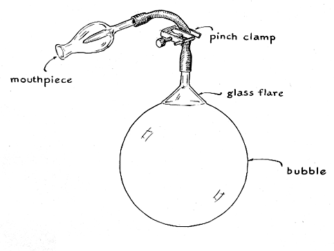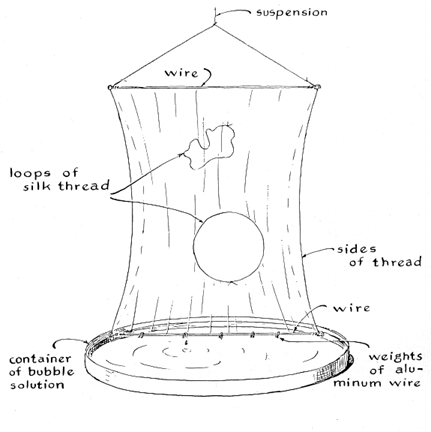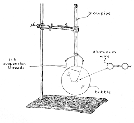 "Tie a length of silk thread into a loop, dip the loop in bubble solution and toss it onto the film. Touch the film inside the loop with a point of dry paper. The film will break, and surface tension outside the loop will snap the thread into a perfect circle. The circle is the only possible shape the loop can assume when it is pulled outward by a uniform radial force. "As mentioned, surface tension compresses the gas inside a bubble. If you punch a small hole in the bubble, air will flow out. The bubble will collapse at a rate that increases with the size of the hole and with the surface tension and decreases with the density of the gas. To make a bubble deflate slowly twist a length of fine wire into a row of three small loops that lie in a common plane. With silk thread tied to the end loops, dip the assembly in bubble solution and suspend the wire against the bubble. To let the air out, puncture the soap film in the middle loop with a splinter of dry wood. "I recently devised a similar experiment that amateurs can use for measuring the surface tension of soap film or the viscosity of a gas if either quantity is known. If both quantities are known, the experimenter can accurately predict in advance of the experiment how long it will take the bubble to deflate from any size to any smaller size. All you need for the experiment is bubble solution, a slender blowpipe, a fixture to support the pipe, a small aquarium and a watch with a second hand. "Blow the bubble, plug the blowpipe with a stopper and measure the diameter of the bubble. Remove the stopper. Time the interval during which the bubble shrinks. Measure the diameter of the shrunken bubble. With these data and the known dimensions of the blowpipe you can easily determine the quantities of interest. "My blowpipe is 29 centimeters long with an inner radius of .183 centimeter. (It is a length of four-millimeter glass tubing.) The ends were pushed into perforated rubber stoppers and the stoppers were in turn pushed into three-centimeter lengths of 10-millimeter glass tubing. These large glass nipples at the ends prevent bubble solution from entering the bore of the small tube. Either nipple will also accept a stopper for plugging one end of the blowpipe. The dimensions are not critical. Any slender tube of about this size will work. It is essential, however, to determine the actual dimensions as accurately as possible. The length can be measured with a ruler. To find the radius fill a portion of the slender tube with mercury and measure the length of the filled portion in centimeters. Transfer the metal to a container and determine its net weight in grams. Divide the weight of the metal by 42.55 times the length of the column. The square root of this quotient is equal to the radius of the tube in centimeters. For example, a 10-centimeter length of my tube holds 14.2 grams of mercury. Therefore its radius is (14.2 / 42.55 x 10)1/2 = (.0333)1/2, or .183, centimeter. "I blow the bubble inside a small aquarium of the type used for keeping tropical fish. (Any large glass beaker or battery jar will do.) The aquarium is covered with a sheet of transparent plastic that has two narrow slots along the middle that lead almost to the hole in the cover through which the blowpipe is inserted; the slots are thus on a straight line through the center. Through the slot I suspend two small plumb bobs made with a silk thread and a penny. To measure the diameter of the bubble I slide each plumb bob toward the bubble until the thread is within .5 millimeter of the soap film, as judged by eye. This brackets the bubble and gives its diameter within one millimeter. "The experimental procedure is simple. Blow a bubble of any diameter. Remove the air hose from the blowpipe, plug the pipe and measure the radius of the bubble. Remove the stopper from the blowpipe and time the interval during which the bubble shrinks. Insert the stopper and measure the smaller radius. "It turns out that the time of efflux varies as the fourth power of the radius of the bubble. Raise each radius to the fourth power (multiply it by itself four times). Subtract the smaller figure from the larger one. Assume, for example, that you let the bubble contract from a radius of two centimeters to a flat film across the end of the blowpipe. The figure would be (2 x 2 x 2 x 2) - 0 = 16. If the bubble had contracted from a radius of 20 centimeters to one of 18 centimeters, the corresponding figures would be (20 X 20 x 20 X 20) - (18 x 18 x 18 x 18) = 55,024.