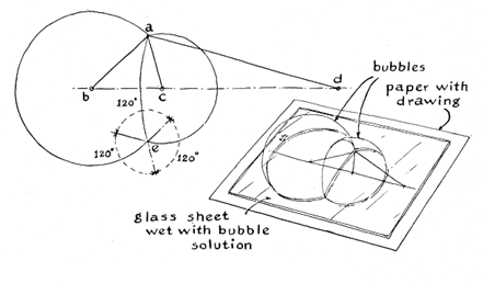 "Foams are also easy to make. Tie a bag of terry cloth around the end of a blowpipe, soak the cloth in bubble solution and blow. The walls between adjacent bubbles make interesting geometric patterns. To observe the walls clearly, blow foam between two sheets of window glass, spaced about an inch apart, that have been moistened with bubble solution. "The air pressure inside a bubble increases as the bubble shrinks. For this reason the wall that is shared by two adjoining bubbles, as in foam, always curves toward the larger of the two bubbles by an amount that can be predicted by simple geometry. For example, make a dot on a sheet of paper. From the dot draw three straight lines spaced at angles of 60 degrees. Then draw a straight line that intersects the three lines. Place the point of a compass at each of these intersections successively and, with the dot as the radius, draw three circles. The two smaller circles mark the boundary that would be formed if two bubbles of this size were placed in contact with each other. The smaller circles intersect the largest circle at two points. The arc of the largest circle included between these two points marks the position of the wall that would be shared by the adjoining bubbles. "This theory was worked out by Plateau. You can prove it by experiment. Place a diagram so drawn under a sheet of window glass moistened with bubble solution. Blow a pair of hemispherical bubbles against the glass, about the size of the two smaller circles. Detach the blowpipe from each bubble and with the end of the pipe center the bubbles over the circles. The size of the bubbles can be adjusted by adding air or letting air escape through a small blowpipe, such as a soda straw. When you have matched the size of the bubbles to the diagram, you will find that the curvature of the shared wall conforms to the geometric prediction. This combination of bubbles can be used to find the total resistance of an electrical circuit consisting of parallel resistors and to predict the distance at which a scene will come to focus behind a lens of known focal length. "Observe also that any three walls of the bubbles make equal angles of 120 degrees at the point where they come together. This must be so because the surface tension of the three soap films is equal: all three films exert pull on the point where they meet. They balance only when the three pulls are exerted in mutually opposing directions. "To prove that surface tension acts uniformly in all directions, cut two wires about 10 centimeters long, bend small loops at the ends and tie the mating pairs of loops together with silk threads about 10 centimeters long. The resulting structure is a rectangle with ends of wire and sides of thread. Attach a bridle thread to one of the wires and dip the assembly in bubble solution. When you pull it out of the solution, a soap film will cling between the wires and the threads. The film will have straight ends and curved sides. If the sides curve inward excessively, hang wire weights to the bottom member.