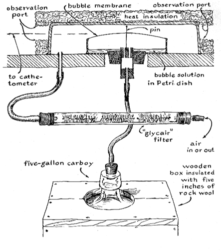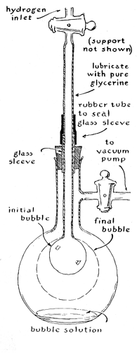 "Assume that you want to determine the surface tension in a soap bubble that contracts from a radius of two centimeters to a flat film in 4.94 seconds. The next consideration is viscosity, which is a measured in units of poises; olive oil at room temperature has a viscosity of about one poise. The viscosity of air at 20 degrees Celsius is 1.83 x 1O-4, or .000183, poise. The surface tension of the two-centimeter bubble is equal to twice the length of the blowpipe, multiplied by the viscosity of the air and the fourth power of the radius as determined above, divided by the product of the time in seconds multiplied by the fourth power of the radius of the blowpipe. The example works out as follows: 2 x 29 x 1.83 x 1O-4 X 16/4.94 x 11.31 X 1O-4 = 30.4 dynes per centimeter. (A force of one dyne is about equal to the weight of a hungry mosquito.) Both the surface tension and the viscosity of the air are now known, so that the efflux time can be predicted. With the same blowpipe, how long would a bubble take to shrink from a diameter of 40 centimeters to one of 36 centimeters? The difference in the fourth power of the radii is 55,024. To compute the efflux time, multiply twice the length of the blowpipe by the viscosity of the air and divide the product by the surface tension multiplied by the fourth power of the radius of the blowpipe. The resulting quotient is a constant: 2 X 29 X 1.83 X 10-4. 30.4 X 11.31 X 10-4 = .309. Multiply the difference in the fourth power of the radii by the constant to get the time in seconds. In this example, 55,024 X .309 = 17,002 seconds, or about 4.7 hours. "Assume that the surface tension of the bubble is known and you want to determine the viscosity of a gas, such as hydrogen. Blow the bubble with hydrogen and proceed as above. Experiment would reveal that the efflux time needed for a hydrogen-filled bubble to shrink from a radius of 20 centimeters to 18 centimeters is about 8,100 seconds. The viscosity of the gas is equal to the product of the surface tension, the fourth power of the radius of the blowpipe and the difference of the fourth power of the radii divided by twice the length of the blowpipe multiplied by the efflux time in seconds: 30.4 x 11.31 X 10-4 X 8,100 . 2 x 29 x 55,024 = 8.76 x 10-5 poise. I find it interesting to blow bubbles with different gases, such as a variety of Freons, and determine their viscosity by this procedure. "A more ambitious project involves the construction of a useful manometer in which a nearly flat soap film functions as the sensing element. The instrument is capable of indicating directly changes in air pressure of less than a millionth of an atmosphere. Cut a circular hole, 45 millimeters in diameter, through the bottom of a plastic Petri dish to take a No. 10 rubber stopper. Perforate the stopper axially to accommodate a sleeve of 20-millimeter glass tubing four centimeters long. Push the sleeve through the stopper from the smaller end until it is flush with the top, and insert the assembly into the Petri dish from the top. Plug the top of the sleeve with a No. 2 rubber stopper perforated by two holes and plug the bottom by a similar stopper that has one central hole. "The assembly rests on a tabletop, preferably one that is covered with hard, smooth plastic. Drill a hole in the table to take the glass sleeve and couple the sleeve to a five-gallon carboy under the table. The carboy must be well insulated against heat, preferably by a covering of rock wool 12 centimeters thick. "Place about 10 milliliters of bubble solution in the Petri dish and blow a soap film across the edge of the dish. Insert a roundheaded pin through the film and into the doubly perforated No. 2 stopper. Drill a second hole in the tabletop near the Petri dish to admit a snugly fitting glass sleeve and couple the lower end of the sleeve to a glycair filter. Invert a cake plate over the Petri dish and insulate it with at least five centimeters of rock wool. Make two holes in the rock wool insulation for observing the relative distance between the pinhead and the soap film. As the barometric pressure changes, the soap film will move up or down in relation to the n pinhead. You can observe the changes through a small telescope. I constructed the device to demonstrate one of many possible applications of soap films. The details of construction are obviously amenable to modification, as is the method of reading the instrument. "In conclusion, I invite both amateurs and experts to help me solve a fascinating puzzle that turned up during a recent experiment. I wondered how a bubble would behave if it were blown with hydrogen in an atmosphere of hydrogen at low pressure. I blew the bubble in a round-bottomed flask that had a side arm and stopcock connected to an air pump. The blowpipe was inserted through a glass sleeve in a perforated stopper that fit the flask, and the telescoping joint between the blowpipe and the sleeve was sealed with a thin rubber tube. Bubble solution was placed in the bottom of the flask. The flask was exhausted to the limit of the air pump, flushed with hydrogen twice and again evacuated. The pump was shut off. Hydrogen was admitted to the flask until a manometer in the system indicated a pressure of 40 torr. The blowpipe was lowered into the bubble solution and withdrawn, and hydrogen was admitted to blow a bubble with a radius of about two centimeters. "Next I shut off the hydrogen supply, intending to observe the rate at which the diffusion of hydrogen through the soap film caused the bubble to shrink. To my amazement the bubble began to expand! Within about four hours it doubled in size. Thereafter it slowly shrank to a flat film as expected. I then blew the flat film into another bubble. The cycle was repeated. "The experiment has been performed with other apparatus and under other conditions but always with the same result. The bubble expands without apparent cause! None of the obvious explanations is satisfactory. My stop