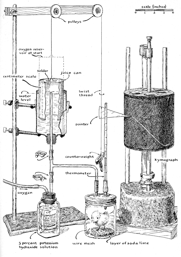 "First find the apparent volume of oxygen consumed by the animal or animals in each bottle during each of the six 10 minute intervals To find the apparent oxygen consumption in cubic centimeters multiply the distance in centimeters that the indicator moved during each 10-minute interval by the previously determined volume per centimeter of the length of the tube. Determine for each interval of time the change in volume of the air that took place in the thermobarometer. The volume of air in the thermobarometer may have increased (indicated by the outward movement of the colored drop or the bubble film), decreased (indicated by the movement of the indicator toward the bottle) or both. "Correct the apparent oxygen consumption to the actual consumption by adding or subtracting from each figure the change that occurred simultaneously in the volume of air in the thermobarometer. Record the actual consumption of oxygen for each bottle during each of the six time intervals. Finally, adjust the actual consumption to standard pressure and temperature. "For each bottle and time interval multiply the actual consumption of oxygen in cubic centimeters by .36 and by the barometric pressure in torr and divide the product by the recorded temperature in degrees Kelvin. Expressed algebraically, the conversion formula is V' = .36VP/T, in which V' is the volume of oxygen consumed at standard pressure and temperature, V is the actual volume as measured by the experiment, P is the barometric pressure indicated by the barometer and T is the observed temperature of the water bath in degrees Kelvin. Record the oxygen consumption as corrected for standard pressure and temperature. "As the final step weigh the animal in grams. Add the corrected volumes of oxygen consumed during the six intervals to get the total consumption for one hour and divide the total consumption in cubic centimeters by the weight of the animal in grams to determine the consumption of oxygen per hour per gram of the animal's weight at standard pressure and temperature. A graph can be drawn to show the oxygen consumption of each experimental animal during the experiment by plotting the oxygen consumption, in cubic centimeters, against time in minutes. "Many variations of the above experiment suggest themselves. One can compare the performance of a single large animal with that of several smaller animals of the same total weight. Similarly, the effects of increased or reduced amounts of light can be measured, but in this experiment take care to maintain the water bath at constant temperature. One animal of a pair can be restrained in a cheesecloth bag while its companion remains free in a separate bottle, thus demonstrating the effects of reduced activity on metabolism. "Most invertebrates exhibit a decrease in metabolic rate with reduced temperature. To lower the animal's temperature immerse one bottle in an ice bath. If aquatic animals are used, each animal chamber and the thermobarometer should contain a standard amount of the water in which the animal normally lives. The chambers should not be more than half filled with water, however, because the air above the water must contain enough oxygen to supply the animal normally during the experimental run. "For animals as large as a mouse the equipment that has been described works nicely if the experiment is limited to about 10 minutes. The animal chamber and the manometer tube must be of appropriate size or the mouse will use up all the oxygen and suffocate. Watch the movement of the soap film carefully during the experiment. If the movement of the film slows appreciably, the animal may be running out of oxygen. In this event remove the bottle from the water bath and open it immediately. Then substitute a manometer tube of about twice the diameter of the first one and try again. "It is also easy to construct a scaled-down version of the spirometer, the instrument used for determining the metabolic rate of humans and other large mammals. The scaled-down instrument [see Figure 1] consists essentially of an airtight animal chamber connected by tubing to a reservoir that is in turn linked mechanically to the stylus of a kymograph, which automatically draws a graph displaying oxygen consumption against time. Apparatuses of this type can be designed for accommodating animals weighing from 50 to 1,000 grams simply by varying the size of the animal chamber and the oxygen reservoir. "For approximating the dimensions of the oxygen reservoir a good rule of thumb is to assume that each hour an animal at rest will require about one cubic centimeter of oxygen per gram of body weight. For example, a spirometer that contains 250 cubic centimeters of oxygen would be adequate for a one-hour test of a 250-gram animal. The accuracy of the measurements will suffer if the apparatus is made excessively large, because the animal will then consume only a small fraction of the available oxygen, thus reducing the change in volume of the spirometer and the resulting excursion of the stylus. "The apparatus has been used for rats, mice and baby chicks. The animal chamber is a wide-mouthed, one-pint Mason jar fitted with a self-sealing lid and screw band. Two 1/4-inch holes were drilled in the metal lid, and a one-inch length of 3/8-inch copper tubing was soldered in place over each hole. One copper nipple is connected by rubber tubing to the oxygen supply; the other one is the exhaust and is fitted with a short sleeve of rubber tubing so that this opening can be sealed by inserting a 19 thermometer. It is extremely important that the system be leak-free. Grease the top of the jar and all rubber-tubing connections lightly with Vaseline, clamp on the oxygen-supply tube and check the apparatus for leaks by immersing it in a tub of water. "Circles of 1/4-inch-mesh hardware cloth were cut to fit the inside of the animal chamber. During the experiment they rest on top of a layer of soda lime (NaOH + Ca(OH)2), which acts as the a