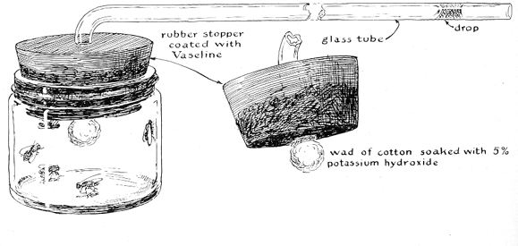 "One of the most accurate and widely used devices for monitoring oxygen consumption was devised by the German physiologist Otto Warburg. As I have modified it for amateur construction it consists of a sealed animal chamber fitted with a slender glass tube that is open at the outer end [see Figure 2]. As oxygen is consumed by the animal more air flows into the chamber through the manometer tube, carrying with it a droplet of colored water or a strong film of bubble solution to serve as a visual indicator of the gas flow. Car bon dioxide exhaled by the animal is absorbed by a solution of potassium hydroxide on a small wad of cotton. I attach the cotton to the inner end of the tube with a rubber band and then moisten the wad with solution by means of a medicine dropper. "The potassium hydroxide, which represents 5 percent (by weight) of the solution, is a form of lye that is both toxic and corrosive. Handle it accordingly. If the solution comes in contact with the skin, wash the affected part immediately with lots of water and rinse with vinegar. The chemical will also burn animals on contact. If the animals can crawl up the sides of the bottle or can fly, I enclose the chemical in a protective cage of wire screening. "I have used this simple apparatus to measure the oxygen consumption of a large variety of small animals, including houseflies, honeybees, fruit flies, earthworms, grasshoppers, crayfish, clams and even fish. Almost any animal can be studied if it is small enough to fit into a wide-mouthed bottle that has a capacity of one or two ounces. Usually I do several experiments simultaneously, using a separate chamber for each animal or group of animals. "Each bottle is closed with a rubber stopper that is perforated to make a snug fit with a glass tube one to three millimeters in inside diameter. The manometer tube should be about 50 centimeters long, bent to a right angle two centimeters from the stopper so that the long segment extends horizontally when the bottle stands upright. The side of the stopper is coated lightly with Vaseline. After one or more animals have been put in each bottle the stoppers are inserted and he]d in place with a wrapping of waterproof adhesive tape. The bottles are placed in a wire rack that is immersed in a water bath so that the necks of the bottles are just at the waterline. The water has been previously heated or cooled to the desired temperature. If necessary, support the outer ends of the tubes so that they are approximately horizontal. "After 15 minutes, when the temperature of the air in the bottles has reached the temperature of the surrounding water, I start the experiment by placing a drop of indicator solution (water tinted with food coloring) in the open end of each tube. (A more sensitive indicator that is easier to measure can be made by substituting for the colored drop a film of durable bubble solution [see "The Amateur Scientist," May]. The film is less massive than the drop and hence responds to smaller differences in gas pressure.) "As the animal