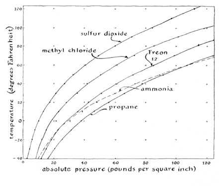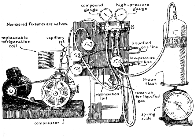 To prevent the wasteful absorption of heat from the air, it is advisable to insulate the freezing coils. For example, a convenient apparatus for chilling glass beakers can be made by winding the freezing coil on a tin can of appropriate size. Solder the coil to the can and place it in a wooden box along with a generous packing of rock wool. If you want to, you can fit the top of the box with a hinged lid. You can insert high-pressure hoses between the machine and the freezing coil. The hoses enable you to manipulate the freezers as you would a hand torch. If the hoses are more than three feet long, you may have to compensate for their volume by adding refrigerant. The machine can be modified in various ways to make it more versatile, convenient or efficient. For instance, you can substitute 1/4-inch copper tubing for the capillary by installing a needle valve at the freezer end of the tube. The valve enables you to regulate the pressure in the freezing coil. Temperature varies with pressure. In the case of Freon 12 you can adjust the valve for any temperature down to -30 degrees F. The same pressure-temperature relation exists on the high-pressure side of the machine, where the temperature is determined in part by the effectiveness of the condenser. The condensers of domestic refrigerators have cooling fins and rely on air convection to remove heat. Normally they operate at roughly 90 degrees F., but the temperature of the vapor inside the pipe averages 20 to 30 degrees higher, and the corresponding pressure ranges from 135 to 155 pounds per square inch. By forcing air through the fins of the condenser with an electric fan the temperature of the vapor can be lowered 20 to 30 degrees. The pressure goes down correspondingly, thereby substantially reducing the load on the compressor. Much the same result can be achieved by connecting two condensers in series. Better yet, you can improvise and install a water-cooled condenser. The capacity of the machine can be increased by connecting two compressors in parallel. Don't overlook the fun of experimenting with refrigerants other than Freon 12. When one makes modifications in the design of the machine, it is interesting to observe what happens inside the system as indicated by pressure measurements. Two systems of pressure measurement, known as gauge pressure and absolute pressure, are in use. For calibrating gauges zero pressure corresponds to atmospheric pressure, whereas in the absolute system zero indicates a perfect vacuum. Atmospheric pressure at sea level is assumed to be 14.7 pounds per square inch absolute and is equal to the weight of a column of mercury about 30 inches high. When air is fully exhausted from a tube that stands in a pool of mercury, the metal will actually rise to a height of 29.81 inches; in the approximate parlance of technicians a "30-inch vacuum" has been created. Subtract 14.7 from gauge pressure in pounds per square inch (abbreviated psig) to get absolute pressure (psia). The pressure-temperature relations of refrigerants are listed by reference texts in one system or the other but usually not in both. An essential tool of the refrigeration technician is a pair of gauges that are calibrated in terms of gauge pressure and in the corresponding Fahrenheit temperature of Freon 12 and Freon 22. One gauge of the pair, used for measuring high pressures, is calibrated from 0 to 500 psig. The other, known as a compound gauge for measuring low pressures, is calibrated from 30 inches of vacuum through 0 to 80 psig. The instruments are mounted on a manifold that has a pair of two-way valves and three screw connections for three hoses. Two of the hoses provide continuous access to the gauges. By manipulating the valves either gauge or both can be connected simultaneously to the center hose. The hoses can be connected to the high-pressure and low-pressure sides of a sealed refrigerator by means of piercing valves, so that pressures can be observed while refrigerant is admitted to the machine through the third hose. Typically the reading on the high-pressure side is about 110 psig and on the low-pressure side about zero.