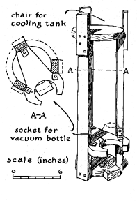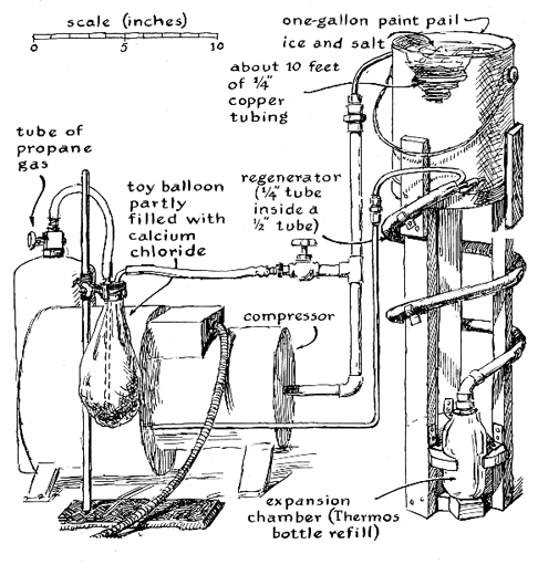 Valves can be installed at other points for isolating and interchanging various parts with minimum loss of refrigerant. For example, one may wish to use a needle valve to adjust the flow of liquid refrigerant to produce a certain temperature in the freezing coil and then, without substantial loss of refrigerant, substitute for the valve a capillary for automatically maintaining that temperature. I do this by first ascertaining the correct valve setting by experiment. The valve is removed without disturbing its setting and is connected to a water supply under low pressure. I count the number of drops that flow through the valve during a timed interval and then adjust the length of a capillary tube, by splicing or cutting, so that water at the same pressure flows through the capillary at the same rate. The adjusted capillary is thoroughly dried and flushed with refrigerant before it is connected to the system. Dry Freon is relatively inert, but with water it becomes mildly corrosive. Moreover, moisture that is trapped in the system may freeze and block the flow of refrigerant. Douglas Miller of Steubenville, Ohio, has made a device from similar parts for liquefying various gases. The basic principles of the machine are similar to those of a refrigerator, but the mechanism differs in that the gas is cooled by alternate compression and expansion until it condenses at atmospheric pressure and collects as liquid in an insulated container. Miller writes: "My apparatus consists of a reservoir of gas to be liquefied, a deflated rubber balloon from which gas is admitted to the compressor at atmospheric pressure, a compressor capable of pumping about 900 cubic centimeters per second, a condenser cooled with a mixture of ice and salt, a heat exchanger known as the regenerator and a Dewar flask for collecting liquefied gas [see Figure 4]. "The capacity of compressors from old refrigerators can be measured with sufficient accuracy by observing the rate at which air from the machine displaces water. I fill a gallon jug with water and invert it in a bucket containing about six inches of water. I connect a hose to the outlet of the compressor, insert the other end in the bottle and time the displacement interval with a stopwatch. A volume of one gallon is equal to 3,785 cubic centimeters. "To make the condenser I wound a 10-foot length of 1/4-inch copper tubing into a helix that would fit inside a one-gallon paint bucket. The ends of the helix were slipped through holes near the top and bottom of the bucket and soldered. "The regenerator consists of a pair of concentric copper tubes five feet long. Compressed gas that has been cooled by the condenser enters the center tube, which is 1/4 inch in diameter, and expands to atmospheric pressure through a nozzle at the other end. The nozzle is made of capillary tubing. The expanded gas absorbs heat from the closed Dewar flask and lowers the temperature of the flask. The cold, expanded gas returns to the compressor via the 1/2-inch outer tube of the concentric pair, where it absorbs additional heat from compressed gas then flowing to the nozzle. Thus the temperature of the compressed gas is lowered both by the condenser and by the regenerator. "As the operation continues the Dewar flask ultimately reaches the low temperature at which the gas can exist in the liquid phase at atmospheric pressure. The regenerator will function as a straight concentric tube, but I made it in the form of a helix to conserve space. The condenser, regenerator and Dewar flask were assembled as a unit on a simple wood frame [see Figure 6]. "Gas is admitted to the machine through the deflated rubber balloon, which contains a few ounces of calcium chloride to absorb water vapor. Unless the gas is dry, water vapor may freeze and clog the nozzle. The drying procedure is particularly essential in the case of gases prepared at home by the reaction of substances in solution. The balloon is closed and suspended by a rubber stopper that contains two holes. Gas enters the balloon through a plastic tube that extends to the bottom of the balloon, where it is surrounded by calcium chloride. Gas filters through the chemical and enters the system through a short tube in the second hole of the stopper. Thus the balloon performs the dual function of drying the gas and maintaining it at atmospheric pressure. "The Dewar flask is closed by a snugly fitting stopper of plastic that I molded around the nozzle end of the regenerator. The plastic comes as a putty-like epoxy resin called 'Black Magic' that hardens in a few hours. It is available from shops that specialize in the repair of automobile bodies. I qleaned the tubing so that the material would adhere to the metal and greased the rim of the Dewar flask to release the plug after it hardened. The plug need not make an airtight seal with the flask, because the compressed gas expands to atmospheric pressure. "The regenerator and condenser must be well insulated to prevent the absorption of heat from the atmosphere. I use a commercial insulation of fiber glass in strip form; it is manufactured for wrapping hot-water pipes. Suppliers of refrigeration materials stock similar insulation in the form of tape that is coated on one side with a pressure-sensitive adhesive. All tube joints should be checked for leaks before the machine is placed in operation. "Although the system will liquefy a number of common gases, I suggest that the novice begin with one of the Freons, because these materials are odorless, nonflammable and nontoxic. Freon 12 is used in domestic refrigerators and hence is available in most communities. To operate the machine, fill the condenser with a mixture of rock salt and ice in the proportions used for freezing ice cream at home. Start the compressor and admit gas until the balloon puffs outward, but not enough to stretch the rubber. Then relax. The machine must pump heat from its various parts before it can chill the gas to the temperature