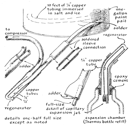 Cut the high-pressure and low-pressure tubes at the point where they enter the freezing coil. Do not use a hacksaw, because particles of copper may enter the tubes, find their way into the compressor and jam it. Cut the low-pressure tube with a pipe cutter of the wheel type. Cut the capillary by filing a deep nick and then bending the tube back and forth at the nick until it breaks. Promptly close the cut ends with adhesive tape. Remove the compressor and condenser assembly from the cabinet and mount them on an improvised base fitted with casters. Obtain a 15-foot length of copper tubing with an outside diameter of 1/4 inch, cut a 10-foot length from it and wind the cut portion into a helical coil of convenient diameter, say six inches. Put a screw connector on one end. A short length of capillary tubing must be soldered in the other end to serve as a nozzle. I did it with a nail of slightly larger diameter than the capillary tube. I put the nail in the open end of the 1/4 inch tubing and, with a pair of pliers, squeezed the side of the tubing until the copper pinched tight around the nail. When the nail was withdrawn, the opening made a snug fit with the capillary. Cut two inches of capillary from the machine, insert an inch of it in the pinched end of the coil and solder the two together. In the same manner solder the other end of the capillary into a three-inch length of 1/4-inch tubing and equip the other end of the 1/4-inch tubing with a screw fitting. Finally, put similar fittings on the cut ends of the low pressure and high-pressure tubes of the machine. The receiver of some machines is quite small and the required amount of refrigerant is correspondingly critical. I equip such machines with a second receiver. It is a six-inch length of 3/4-inch pipe closed with pipe caps. I drill the caps and thread the holes to accept tubing connectors. The modified machine must be re charged with oil and refrigerant. Mea sure the amount of oil that escaped and put the same amount of fresh refrigeration oil in a jar with a wide mouth. Refrigeration oil is specially treated to remove waxes and minimize the tendency to foam when the oil is charged with refrigerant. Put a small, clean hose on the inlet tube of the compressor, which you have supplied with a screw fitting, insert the open end of the hose in the fresh oil and apply power to the motor momentarily. The oil will be sucked into the compressor. Install the new freezing coil. Be sure to connect the nozzle end to the high pressure tube (the one that includes the capillary). The nameplate of the ma chine specifies the kind and amount of refrigerant required, such as "Freon 12 #1" or "R-12 16 oz." Both indicate that the machine requires one pound of Freon 12. Certain old machines may specify sulfur dioxide or methyl chloride, and some special machines may require R-22, R-500 or R-502.