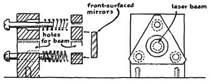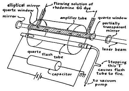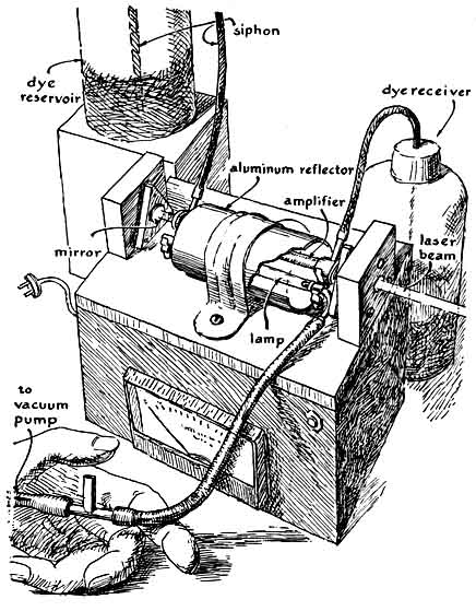 The amplifying medium of the laser is a dilute solution of organic dye that is periodically "pumped," or illuminated, by a homemade flash lamp. The output is an intense beam of coherent light five millimeters in diameter that can be focused to a point with lenses. The sharpness of the point is limited only by the wave nature of light. The beam can also be spread into a pattern of diverging rays. The color of the coherent rays is determined by the nature of the dye. Various dyes can be used. Each of them generates light that spans a characteristic portion of the spectrum. The laser can be tuned to generate light of any wavelength within these ranges by means of a diffraction grating. When the laser is pumped at a sufficiently high rate, say 60 pulses per second, the output beam appears to the eye to be continuous. This modification increases the cost substantially, because the size of the power supply must be increased and provisions must be made for cooling the unit. Like the helium-neon laser, the dye laser consists essentially of a slender amplifying tube, or dye cell. The ends of the tube are closed by a pair of flat windows that face a pair of mirrors. A second tube, the flash lamp, is mounted parallel to the amplifying tube. Both tubes are surrounded by an aluminum tube of elliptical cross section with an interior surface that is highly polished to function as a mirror. The axis of the amplifier tube occupies one focus of the elliptical mirror and the axis of the lamp occupies the other focus. White light emitted by the lamp is thus concentrated by the mirror on the amplifying tube [see illustrations left and right]. The amplifying tube is filled with an alcohol solution of dye that is known to fluoresce. When such solutions absorb white light, some molecules of dye acquire an abnormal amount of energy and so are raised to what is termed their lowest excited singlet state. Later they spontaneously emit the excess energy as light of longer wavelength. This is the phenomenon known as fluorescence. If the white light is sufficiently intense, as it is in the dye laser, a majority of the dye molecules absorb more than enough energy to reach the singlet state. Hence they are raised to one or another of the possible higher energy states. From these levels they can also drop back spontaneously to lower energy states by emitting light. Some of these emitted waves, strictly by chance, head toward one or the other of the laser's flat mirrors, which reflect the light waves back into the amplifier tube. Here the waves stimulate other excited molecules to emit excess energy. The resulting emission is identical in color, and so in wavelength, with the stimulating waves. The waves merge and thereafter proceed in lockstep. In effect, the waves that were emitted spontaneously are amplified and continue to accumulate energy as they are subsequently reflected back and forth through the tube [see "Organic Lasers," by Peter Sorokin; SCIENTIFIC AMERICAN, February, 1969]. The flat mirrors of the dye laser are coated with aluminum. One mirror reflects about 92 percent of the incident light and absorbs 8 percent. The other mirror, which has a thinner coating, reflects 74 percent, absorbs 8 percent and transmits about 18 percent. The transmitted portion constitutes the output beam of the laser. In Lankard's apparatus it amounts to about 5,000 watts per pulse, which is a million times more intense than the output of the helium-neon laser! This substantial power and the tunable feature of the laser open new experimental opportunities to amateurs who have been restricted to the helium-neon and argon lasers previously described in this department [see "The Amateur Scientist; SCIENTIFIC AMERICAN, September, 1964, December, 1965, February 1967, and February, 1969]. It bears repeating that laser action occurs only if the dye is exposed to white light of sufficient intensity. Lankard developed the required intensity with an extraordinarily simple lamp. It is a tube of fused quartz provided with stainless-steel electrodes and filled with air. The electrodes are connected to the terminals of a 15-microfarad capacitor charged to a potential of 3,000 volts. To flash the lamp Lankard pumps air from the tube. When the pressure falls to about 60 torr, the capacitor discharges through the lamp. The resulting flash consumes some 35 megawatts of power and persists for about two millionths of a second. The capacitor is specially designed to discharge in that brief interval. Ordinary capacitors discharge more slowly and will not work in this application. The dye emits only a small part of the absorbed energy as coherent light. That part is transformed into heat that causes random differences in density throughout the column of dye and, as a result, random differences in the optical refraction of the fluid. Fortunately the heating effect lags behind the flash by several millionths of a second. By the time the optical distortion becomes substantial the laser light has been emitted. The dye must be at uniform temperature, however, before the laser can be pulsed again. A convenient method of cooling is to circulate dye continuously through the amplifier tube. The tube consists of an 80-millimeter length of seven-millimeter quartz tubing with a bore of five millimeters. The ends of the tube are closed by flat windows cemented in place at the edges with epoxy cement. Dye solution flows into one end of the tube through a port in the side and out through a similar port at the other end. The ports can be made by welding short lengths of quartz tubing, as side arms, near the ends of the amplifier tube. Fused quartz is difficult to soften and manipulate. It must be worked in an oxyacetylene flame. Lankard suggests the use of metal tubing as an alternative. A T fitting can be improvised from copper or stainless-steel tubing. The inside diameter of the T should be seven millimeters to match the outer diameter of the quartz tube. One end of t
