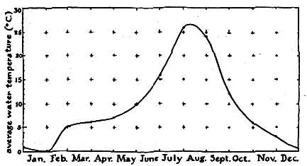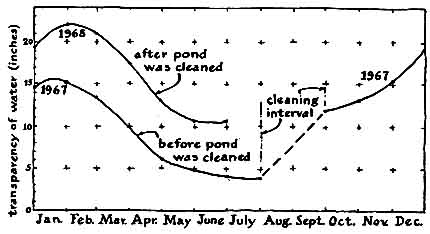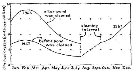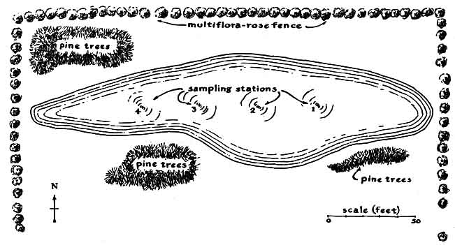 Careful management is essential if pond is to serve these purposes, because every open body of water becomes a active universe of plants and animals The character of a pond's population changes from day to day and year to year, not always in directions that pleases the human user. When the direction of the change is disappointing, the use may say that the pond has become "polluted" or "sick." In fact, every pond is a healthy environment for the organisms living in it, although they may not appeal to the owner. To encourage the development of a desired population, the owner must make a limnological study of the pond, which entails determining the physical, chemical and biological conditions of the water and modifying them to meet the preferences of the desired population. An example is a small pond that was created 15 years ago on a farm near Keystone, Ind., and figured in a prizewinning science-fair project undertaken by Betty Sue Settle, the daughter of a teacher and farmer who made the pond. Miss Settle, now a student at Ball State University, writes: "Our pond was established in 1955 on the slope of a field about half a mile from our house as a water supply for cattle pastured at the back of our farm. The water was pumped to the animals so that they would not contaminate the supply. In its second year the pond was stocked in the proper proportion with prey and predator fish: fingerlings of bluegill and largemouth bass. The fingerlings developed rapidly and provided fine fishing until the extremely cold winter of 1963, when the water froze to a thickness of 13 inches. None of the fish survived, even though more than five feet of water remained under the ice. In later years all efforts to restock the pond failed. Fingerlings did not survive in the water for more than a few days. Late in 1966 I decided to find out what had gone wrong. To that end I bought a few books on basic ecology. "Our pond is roughly oval in shape, about 250 feet long, 75 feet across at the widest point and roughly eight feet deep in the middle. Like all ponds, it consists of four more or less distinct environments or zones, each uniquely hospitable to certain groups of plants and animals. For example, large plants take root and do best in shallow water near the edge. The upper layer of water beyond these plants, which receives the most light, encourages the growth o plankton, including algae, protozoans diatoms, crustaceans and rotifers. The middle layer below receives less sun- light and is cooler; it supported our fish. The bottom layer, which exists only at the deepest part of the pond and tend to merge into the middle layer where the water becomes warm in midsummer, is about a foot thick, dimly lighted, cold and low in dissolved oxygen. This zone is inhabited largely by microorganisms that feed on and thus help to decompose particles of organic debris that settle from the upper layers. "To investigate the physical, chemical and biological conditions of the pond throughout the year I established four collection stations, equally spaced along the major axis of the ellipse. The positions were determined by reference points on the bank, such as particular trees and nooks. Specimens were collected from these stations at the end of each month. In summer a collecting vessel could be moved to the center of the pond by a pulley that rode on a suspension rope anchored to the banks. Station No. 1 was at the east end of the pond at what was thought to be the deepest point. At Station No. 1 and Station No. 2 specimens were taken from the surface and the bottom layer, whereas at Station No. 3 and Station No. 4 they were taken from the bottom only, because of the shallowness of the water. "Observation of the physical conditions was limited to temperature, transparency of the water and thickness of ice (when ice was present). Transparency was measured by lowering an aluminum plate on a rope until the plate could not be seen and then raising it until the plate became visible. The distance was determined by calibrations on the rope. In winter blocks of ice were cut with a large handsaw and carefully removed for measurement of the thickness with a steel tape. "Chemical observations included the determination of dissolved oxygen, the relative acid-alkaline balance in units of pH and the measurement of free carbon dioxide. The Winkler method of oxygen determination has become the most generally used means of measuring dissolved oxygen in ponds because of its convenience and the fact that it yields sufficiently accurate results. To make this measurement I put 250 milliliters of pond water in a bottle and added by pipette two milliliters of manganese (II) sulfate and two milliliters of alkaline iodide solution. The brown precipitate that formed was then dissolved by two milliliters of concentrated sulfuric acid. The resulting manganese (IV) sulfate reacted with potassium iodide in the alkaline iodide solution to form soluble iodine. The iodine was titrated with a standard solution of sodium thiosulfate, using starch as the indicator. "Standard manganese (II) sulfate solution is prepared by dissolving 368 grams of the chemical in distilled water to make one liter. Alkaline iodide solution is prepared by dissolving 500 grams of sodium hydroxide and 150 grams of potassium iodide in distilled water to make one liter. Sodium thiosulfate is prepared as a .025 normal solution because this concentration simplifies the calculation of weight equivalents for iodine and oxygen. I prepared the solution by dissolving 6.2 grams of sodium thiosulfate in distilled water to make one liter. "During the reaction each equivalent weight of dissolved oxygen produces an equivalent weight of iodine. Therefore the titration of iodine can serve as a direct method of determining the number of parts of oxygen in a million parts of water solution. For example, if the addition of eight milliliters of sodium thiosulfate alters the color of the solution, the specime