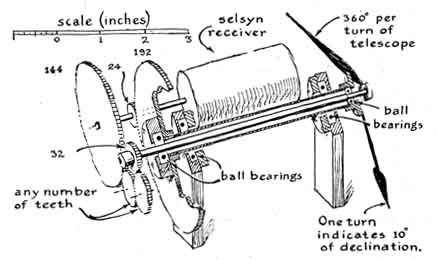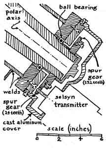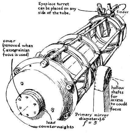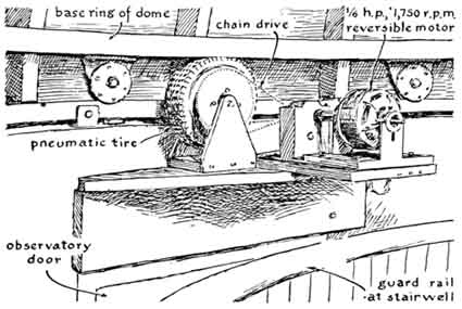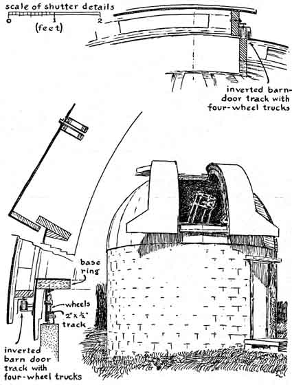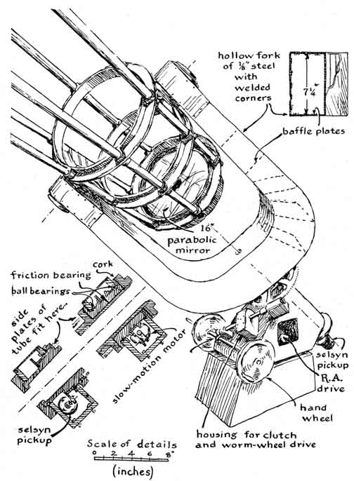 The installation is remarkable in many respects. For example, the instrument embodies more scaled-down features of the 200-inch Hale telescope on Palomar Mountain than I have encountered heretofore. The two-story observatory building, made of masonry, has a motor-driven dome of reinforced fiber glass. The building includes a photographic darkroom, a machine shop and a study. All the functional elements are controlled electrically, including a system of remote dials that continuously monitor the telescope's position as it tracks an object across the sky. The installation is the more remarkable because the older of the builders had no burning enthusiasm for either astronomy or telescope making when he began work on his first telescope. He was tricked into taking up telescope making by a friend, the late James H. Wyld, who was a pioneer in the design and construction of rocket engines. Wyld had become a telescope buff after reading in this department a report by the late Albert G. Ingalls on a group of amateurs in Springfield, Vt., who in 1920 had made a number of small reflecting telescopes. Wikswo tended to look down his nose at telescope making. The deceptively simple appearance of a reflecting telescope rarely challenges the inexperienced eye. After much urging by Wyld, however, Wikswo reluctantly agreed to try his hand at a six-inch instrument He spent almost a year on the project. Most amateurs would have finished it in 60 days. The difference was that Wikswo's telescope rivaled the excellence of a finely made watch. Wyld took one look through it and contrived a scheme for binding Wikswo forever to his avocation. Although Wyld was young and in perfect health at the time, he provided in his will for the purchase of two specially cast 16-inch disks of Pyrex as a bequest to Wikswo. In 1952 the disks were delivered. Wyld knew his man. The astonished Wikswo has been working on the telescope ever since. Recently he invited me to inspect the results. To reach the observatory you turn left off Route 29 about 10 miles north of Amherst and follow the narrow road that winds northwest through the Blue Ridge mountains. Somewhere between the villages of Piney River and the Forks of Buffalo the road enters an oval valley. Atop a large knoll that rises in the valley you spot the dome of the observatory under a sky that is usually crystal clear. A breath of the fresh air almost justified the trip. "We were against pollution in these parts," Wikswo explained, "long before the idea caught on elsewhere. My neighbors on the crests of these mountains learned from skilled ancestors the art of firing a whiskey still without creating a telltale plume of smoke. That's one reason I'm here." Wikswo explained another of his reasons as we made our way along a footpath to the observatory. A vein of titanium ore runs for seven miles through a neighboring mountain. He heads a group of chemists that develops methods for processing the mineral. The door of the observatory opens onto a landing from which a spiral staircase leads to the observing floor above and the darkroom below [see illustration at right]. The cylindrical wall is made up of curved cement blocks. The overlapping dome is formed by two dozen curved trusses of fir overlain by a sandwich of Masonite and fiber-glass cloth cemented with polyester resin. The weight of the dome is carried by a base ring of laminated wood; the ring has flanged wheels that roll on a circular track of steel. The track was bent from bar stock two inches wide and half an inch thick. It is anchored to the rim of the concrete wall. The telescope is supported at the center of the dome by a concrete pier that extends down through both floors to bedrock and is insulated against mechanical vibrations. You can jump on either floor without vibrating the instrument. The dome is rotated by frictional contact between the laminated base ring and a pneumatic tire on a motor-driven wheel. Access to the sky is through a pair of weatherproof shutters in the dome; they open to form a slit one yard wide from the horizon to the zenith. The shutters, which were built in an old farmhouse that came with the property, are also made of Masonite and fiber- glass. They are operated with a hand wheel through a system of cables. This is one of the few features of the observatory that Wikswo has not mechanized. The fork that supports the tube of the telescope and rotates the instrument in right ascension, or celestial longitude, is of the welded box-girder type stiffened with internal partitions [see illustration at left]. The fork includes bolting plates an inch thick for attaching the shaft and the housings of the declination bearings. Although the instrument weighs more than 600 pounds, it moves easily in any direction. The tube is rotated in right ascension by a synchronous motor that operates at 1,800 revolutions per minute in combination with a gear system that includes a differential mechanism. A direct-current motor coupled to the differential is used for turning the tube to any part of the sky. The gearing in both declination (north-south direction) and right ascension includes selsyn (self-synchronous) transmitters that couple electrically to companion receivers operating dials for monitoring the position of the instrument. When the telescope is tracking a star automatically, a selsyn motor geared to the polar shaft communicates the rotation synchronously to a companion motor coupled to one input shaft of a differential in the dial mechanism that indicates right ascension. Concurrently rotation in the opposite sense is fed into the second input shaft of this differential by a clock motor that keeps sidereal, or star, time. The two inputs cancel. Accordingly the dial remains fixed and indicates the unchanging position of the telescope in right ascension. When the telescope is stopped, the clock takes over. The dial now advances at the sidereal rate, thus indicating the telescope's changing position wi