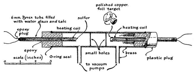 The apparatus required for doing such experiments is reasonably simple and can be built at home, much of it from cast-off odds and ends. For example, Roger Flood of Natick, Mass., recently devised an apparatus for generating a slender beam of sulfur molecules and detecting it chemically. His device was based on an apparatus developed in 1911 by the French physicist Louis Dunoyer for generating a beam of sodium molecules. From a piece of glass tubing about eight inches long Dunoyer made a vessel in the form of three interconnecting bulbs. The vessel resembled an hourglass with three bulbs instead of two. A bulb at one end contained a small lump of sodium. When Dunoyer pumped the air from the vessel and heated the sodium, a dark spot appeared on the wall of the bulb at the opposite end. The spot was in perfect alignment with the small openings that interconnected the three bulbs. The position and size of the spot could be explained only on the assumption that molecules of evaporated sodium had traveled in straight lines through the openings to form a beam of particles that condensed on the glass. Flood's version of the generator was made largely of metal. "My apparatus," he writes, "is identical in principle with Dunoyer's. It consists of a brass tube about half an inch in diameter and four inches long that is divided into three compartments by two brass disks that serve as partitions. A pinhole in the center of each disk interconnects the three compartments. The disks fit snugly in the tube and are soldered in place half an inch apart near the middle of the tube. The ends of the tube are closed by plastic plugs removed from a pair of UG-680/U coaxial-cable connectors. O rings inserted between the shoulders of the plugs and the ends of the pipe make the assembly vacuum-tight. "The compartment at one end serves as an oven for evaporating sublimed sulfur. The perforated disks and the space between them function as a collimator: only the molecules that follow a straight path through the perforations are transmitted. The beam is detected in the third compartment, where molecules of sulfur react with a plate of-hot copper to form a black deposit of cupric sulfide. This method of detecting a molecular beam is approximately a million times more sensitive than mechanical techniques of depositing a spot of sulfur thick enough to be visible to the unaided eye. "The sulfur is evaporated by an electrically heated coil inside a tube of Pyrex glass. The tube is supported by one of the coaxial connectors [see illustration at left]. The coil is made from 30-gauge Nichrome wire, whose ends are crimped to copper leads. The outer end of the glass tube is sealed with epoxy cement and the interior is partly filled with a paste of water glass and talc that serves as insulation. The inner end of the tube is open. It is charged with a few milligrams of sulfur just before the apparatus is assembled for operation. "A similar tube heats the copper target, which is a small piece of polished copper foil crimped in the form of a cup over the end of the glass. The proper operating temperatures are determined by experiment. Sufficient voltage should be applied to the vaporizing coil to melt sulfur in air within one minute. Similarly, sufficient voltage should be applied to the target coil to produce a thin coating of copper oxide in air within three minutes. "The apparatus must be