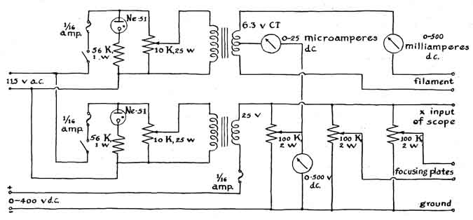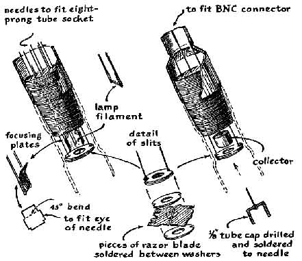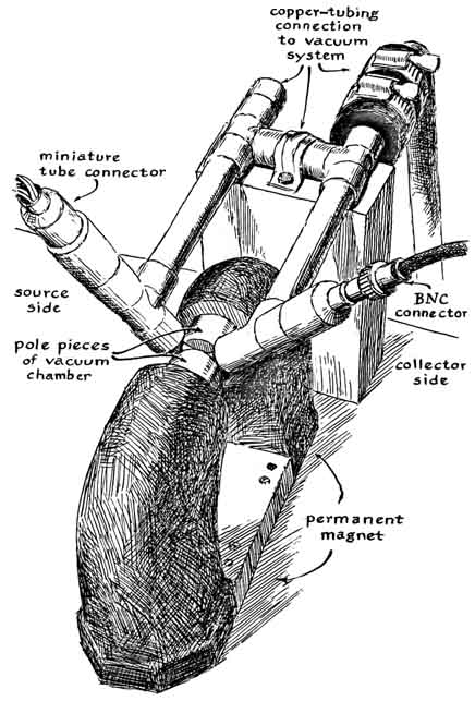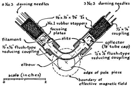 exhausted to a pressure of at least 10 "I apply a thin coating of vacuum grease to the O-ring seals. After the system has been exhausted to the limit of the pumps I heat the target for about five minutes and turn on the oven heater to vaporize the sulfur. A perceptible spot should form on the target within 15 minutes. I then turn off the oven heater but keep heating the target for another five minutes to ensure that the decaying beam continues to react with the copper. Air is admitted after the apparatus has cooled to room temperature, a procedure that prevents the target from oxidizing. The target is now examined. If all has gone well, a black spot with sharp edges is seen on the target. A fuzzy spot or random sputtering usually indicates that air is leaking into the system or that the pumps are not working properly. "Molecular beams of many chemical elements can be detected by their reaction with appropriate target materials, but I have experimented with only two other combinations. A beam of hydrogen reduces yellow molybdenum trioxide to blue molybdenum dioxide. Oxygen reacts with lead monoxide, which is pale yellow, to form lead dioxide, which is brown. I admit the gases to the heater tube through a small leak and operate the pumps continuously to maintain the desired low pressure." BY replacing the collimating apertures of Flood's apparatus with a pair of slits and passing the beam first through an electric field and then through a magnetic field, atoms constituting the beam can be separated into isotopes. The resulting apparatus is appropriately called a mass spectrometer because it sorts and separates isotopes according to their mass. In the December 1963 issue of the American Journal of Physics the late John W. Dewdney of Harvard University described the construction of a mass spectrometer that he assembled from copper tubes, darning needles, razor blades, a miniature incandescent lamp and other inexpensive parts. In l963 the complete instrument cost less than $5, not counting the magnet and vacuum pumps. The substance to be analyzed is vaporized by the incandescent filament of a small lamp bulb. Adjacent to the filament is a pair of metal plates and a pair of facing razor blades spaced to form a narrow slit. A potential difference of about 100m volts is applied to the plates and the filament. The resulting electric field accelerates the ions and focuses them on the slit between the blades. Ions pass through the slit as a diverging beam and enter a magnetic field placed at a right angle across the beam. The field creates a deflecting force that always acts at right angles to the direction in which the ions move. The force continues to act at right angles even though the path of the ions curves continuously. As a result the ions move in a circular arc. Overlapping arcs of equal radius intersect at two points. Hence the diverging beam of ions, which escape through a slit and enter a uniform magnetic field, converges at a distant point. In effect the magnetic field acts as a lens that focuses ions from a source slit onto an object slit [see illustration at right]. In Dewdney's mass spectrometer the magnet bends the path of the ions through an arc of 90 degrees and brings them to focus on an object slit. The object slit is also made of razor blades. Ions that pass through the object slit strike a collector electrode, to which they transfer charge. A continuous stream of ions that reaches the collector electrode induces a continuous current in the output circuit. The intensity of the current is a measure of the number of ions that impinge on the collector. The magnetic field does not deflect all ions equally. Ions of low mass curve more sharply than those of higher mass. (In much the same way, although for different reasons, a simple lens bends short waves of light more sharply than long waves.) Moreover, ions that move at low velocity are deflected more than those that move at high velocity. The velocity of ions emerging from the source slit is determined in part by the potential difference between the filament and the focusing plates. By changing this potential one can alter the influence of the magnetic field on the path of the ions. In effect the focal length of the "magnetic lens" can be adjusted by adjusting the accelerating voltage. Dewdney altered the accelerating voltage continuously by connecting an alternating-current transformer in series with the source of accelerating voltage. This arrangement automatically focuses ions of differing mass sequentially on the object slit and causes corresponding currents to appear sequentially in the output current. The current can be applied, after appropriate amplification, to the vertical plates of an oscilloscope. The same continuously varying potential can be applied to the horizontal plates of the oscilloscope. The combination causes the oscilloscope to display a trace in the form of a jagged line, each peak of which corresponds to a species of isotope in the beam. With this technique Dewdney made a graph of the isotopes of potassium [see illustration at left]. The graph displays two peaks. The shorter one shows the relative abundance in the beam of potassium of mass 41, and the larger peak displays the more abundant isotope of mass 39. The vacuum chamber of the spectrometer and the ports through which air is exhausted are assembled from copper plumbing parts. The chamber consists of a pair of 1/2-inch copper T's; the crossarms are coupled by a 90-degree elbow of 1/4-inch diameter through reducers that were sawed off flush with the end of the T's. The legs of the T's are coupled to the vacuum pumps by 1/2 inch copper tubing [see below right]. All joints are soldered. The functional parts of the instrument, which include the filament, focusing plates, slits and collector electrode, are supported by No. 3 steel darning needles pushed through No. 1 rubber stoppers that fit the open ends of the T's. Dewdney warned that the installation o