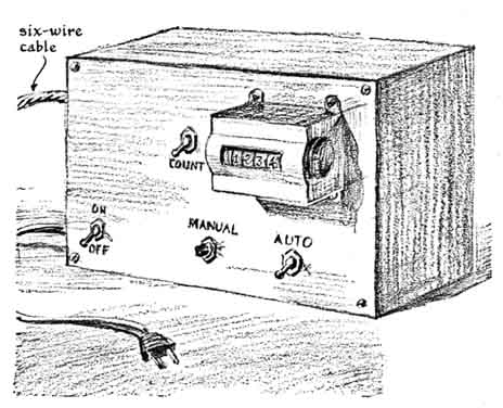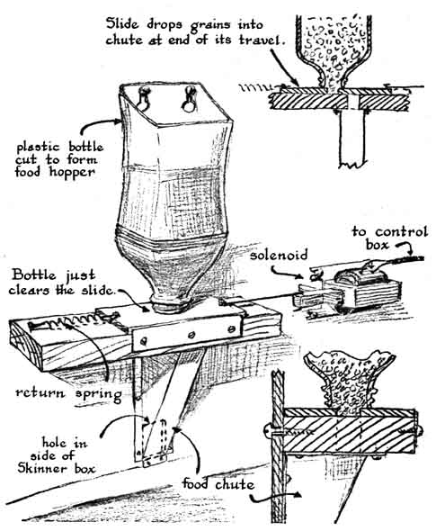 Moran set out to investigate visual perception in pigeons and in particular to compare their color vision with that of humans. He succeeded so well that his project was numbered among the top winners at the 1970 International Science Fair. Moran describes his experiment as follows: "The eyes of mammals contain photosensitive cells of two kinds: rods, which are extremely sensitive to light but insensitive to differences in color, and cones, which are less sensitive to light but instrumental in the perception of color. Investigators have learned by dissection that the eyes of nocturnal animals, including mice and dogs, are deficient in cones [see "Visual Cells," by Richard W. Young, page 80]. Presumably these animals see the world largely in monochrome. In contrast, the eyes of numerous fishes, reptiles and birds have many cones. The retina of the land tortoise has no rods. These animals should perceive color at least as vividly as people do. "I should have enjoyed experimenting with tortoises to check this assumption, but they are difficult to train, and so I settled for pigeons. A friend who makes a hobby of racing pigeons gave me two males and two females, together with basic instruction m the care of pigeons. I took the birds home in small cages made of wire screen on a wood frame with a plywood floor. Larger quarters were then built with similar materials. The permanent cage consisted of three interconnecting compartments. Two of the compartments are 10 feet long, two feet wide and two feet high. They were stacked one on top of the other and connected at one end to the third compartment, a four-foot cube. Openings about 12 inches square near the floor enabled the birds to move at will among the three compartments. Open boxes at floor level extended from the outside into the cube for providing feed, grit and water. A layer of sand on the floor absorbed droppings and kept the cage reasonably decent between cleanings. No experiments were made until the birds became accustomed to their new surroundings and began to breed. "The contrived environment to which the birds were ultimately subjected was provided by a version of an apparatus developed by B. F. Skinner of Harvard University. The apparatus essentially consists of an 18-inch cubical box. In it a pigeon is exposed to a small window that admits light of a selected color to the compartment [see illustration at left]. When the bird pecks the window, an electrical mechanism drops a measured quantity of food into the box, provided that certain switches have been placed in the correct position. The bird can thus learn to reward itself for pecking at light of a predetermined color. Conversely, it can also learn that no reward will follow the pecking at light of other colors. Skinner developed the apparatus primarily for measuring the rewarding effect of a stimulus by counting the number of times an animal would perform an act leading to a reward compared with the number of times it would perform an unrewarded act. "The electrical circuit of my box includes an inexpensive digital counter that is actuated when the bird pecks the window, if a switch is in the proper position. The apparatus can be altered in many ways for making other experiments. For example, one interesting variation that illustrates the versatility of the apparatus consists of a box equipped with a lever at one end that causes food to be deposited at the opposite end. Two cats were put in the box, one at a time, until each had learned by trial and error to operate the lever and so obtain food. After the cats had mastered the operation both were put in the box. Thereafter one cat spent the entire time patiently working the lever until the freeloader at the other end had gorged itself! "The Skinner box I made had been modified several times. The version I shall describe requires relatively few parts and is adequate for investigating the color perception of pigeons. The top and bottom and three of the sides of the 18-inch cube are quarter-inch plywood. I install one side of transparent plastic when I want to demonstrate the experiment, but otherwise I use a white opaque material and shine a bright light into the box. Another side of the box has a circular window an inch in diameter located seven inches above the floor. A square opening of the same size is made below the window, three inches above the floor. A rectangular tube that slants downward enters the box through the lower opening. The tube serves as a chute for admitting food to the box from an automatic dispenser. The upper opening is the window that admits colored light to the box. When the bird pecks the window, food drops through the chute at its feet, if the experimenter has preset the appropriate switch. ''The window assembly [see illustration at right] functions as an electrical switch. Its contacts are normally closed. The assembly includes a strip of quarter inch pine about two inches wide and four inches long hinged at one end to a similar strip of transparent plastic; together they close like a book. A hole near the bottom end of the pine strip matches the window in the box. The strip is mounted to the box so that the holes coincide. The bird can momentarily knock the plastic away from the window by pecking through the opening, thereby separating the heads of a pair of brass machine screws that serve as electrical contacts. One of the screws passes through the wood just above the window; the other goes through the plastic. The force of a weak compression spring restores the circuit. The spring is held in place by a third machine screw that is fastened to the wood just below the window and passes through an over size hole in the plastic. To diffuse the light that enters the box I cemented to the outer surface of the plastic half of a table-tennis ball positioned to cover the opening. Light scattered by the translucent ball can be seen easily from most positions inside the box. "The light source is a 35-millimet
