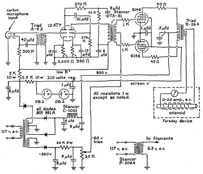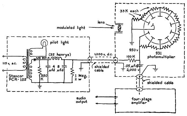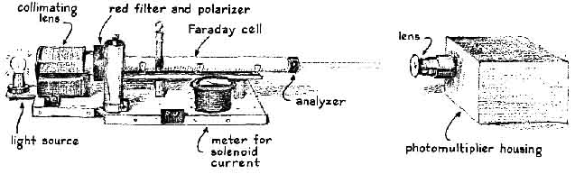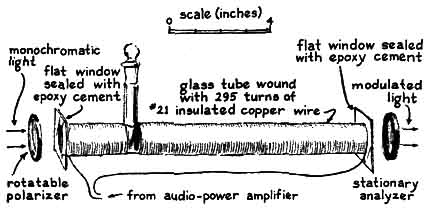 Several modulation schemes have been proposed, including a device based on the effect first described in 1845 by Michael Faraday. He observed that a block of lead glass, when it is immersed in a strong magnetic field, rotates the plane of vibration of light waves. Other experimenters demonstrated the Faraday effect in various solids and in gases and liquids. Recently Don Smith, a Mobile, Ala., high school student, used the Faraday effect for modulating both laser light and ordinary light. He describes the as follows. "Essentially the apparatus consists of a tubular glass cell of fluid that forms the core of a solenoid (a cylindrical coil of magnet wire). The solenoid, when it is energized by electrical signals, sets up a magnetic field in the fluid. The strength of the field varies in proportion to the amplitude of the signal current. "The light to be modulated enters the cell through a polarizing filter, commonly known as the polarizer, that restricts the vibration of the light waves to a single plane. As the waves proceed through the fluid the plane in which they vibrate is rotated by an amount that varies with the strength of the magnetic field and hence with the strength of the signals. Light waves that emerge from the cell encounter a second polarizing filter, called the analyzer, that is relatively transparent to waves that vibrate in one plane, opaque to waves that vibrate at right angles to this plane and of proportionate transparency to waves that vibrate in planes between these extremes. The analyzer is adjusted to the position of maximum transparency for light waves that are rotated through the largest angle. With the apparatus so adjusted, variations in the strength of signals are reproduced as variations in the brightness of the emerging light. The electrical signal can be reproduced at a distant point by inserting a photoelectric cell in the modulated beam. "The amount of information that can be impressed on light by the Faraday effect is limited primarily by the loss o energy in the cell. The solenoid functions as an induction furnace as well as a modulator. It can melt lead glass if it is energized by high-frequency current of sufficient strength. Other materials including certain liquids and gases, absorb less energy. Most of my experiments have been done with carbon disulfide although I have also used water and nitrobenzene. "The cell of my apparatus consists of a glass tube about 2.5 centimeters in diameter and 30 centimeters long closed at the ends by flat glass windows. Fluid is admitted to the cell through a port near one end. A short length of 1/4-inch tubing is sealed to the port. The windows can be made of cover glasses of the kind used for protecting 35-millimeter photographs. Affix them to the ends of the tube with epoxy cement. The solenoid, consisting of 295 turns of No. 2 enameled copper wire in a single layer was wound directly on the glass tube. "The solenoid is powered by an audio frequency amplifier that develops a output of some 200 watts and a maximum current in the winding of 12.6 amperes. The amplifier consists of two stages of speech amplification; the drive a pair of beam-power tubes in the output stage. The construction is conventional except for the output transformer. Most commercial output transformers are designed to match the impedance of loudspeakers, which range from four to 16 ohms. The impedance of my solenoid is only 1.2 ohms. "I solved the matching problem b using for the output transformer a 100 watt power transformer that happened to be on hand. It is designed to operate from a 117-volt power line and has three secondary windings. One winding is center-tapped and rated at 800 volts. Two are 6.3-volt windings rated for an output current of 15 amperes each. I reversed the transformer, using the center-tapped 800-volt winding as the input and the two 6.3-volt windings in series as the output [see illustration at left]. "Although the transformer is rated at only half of the peak power that the amplifier can develop, it is adequate because the average power of an audio signal rarely exceeds 30 percent of the peak power. The match between the secondary winding and the solenoid appears to be reasonably good. An experimenter could easily substitute any comparable transformer, such as the Triad Type R-26A. "I also had another transformer of unconventional design that I used for the power supply. One of the secondary windings develops about 600 volts and the other 250 volts. When rectified and filtered, these potentials become 800 volts and 360 volts. They are respectively used for the plate voltage and the grid-bias voltage of the output stage. A pair of transformers such as the Stancor PC-S405 and PS-8416 would develop the required voltages. Plate voltage for the input stage can be on the order of 100 to 120 volts and, with rectification, can be taken directly from the power line. "The receiver that I use for picking up the modulated light and converting it into sound consists of a Type 931 photomultiplier tube, a power supply for energizing the photocell and a conventional audio amplifier of the kind used in record players. A simple lens, which can be an ordinary reading glass, focuses the modulated light on the photocathode of the photomultiplier. Incidentally, the light source must be monochromatic because the amount by which the Faraday cell rotates the plane of polarization varies with wavelength. In the case of white light some component colors would be rotated more than others, thus lowering the effectiveness of the cell. An incandescent lamp can be used as the light source by including in the lamp housing a simple lens for bending the rays into a parallel beam and by inserting a color filter, such as a sheet of red transparent plastic, just ahead of the polarizer. An ideal light source is a helium-neon laser with Brewster windows. The laser beam is both monochromatic and polarized, eliminating the need for the collimating lens, the co