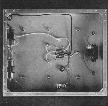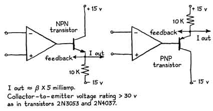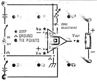 factor, or gain, is exactly equal to the ratio of the feedback resistor (R "The differential configuration compares voltages from two sources. In effect, it subtracts one quantity from another. Its applications include automatic control devices and pen recorders. "The current-to-voltage configuration is a powerful circuit for amplifying the output of sources that develop small current signals rather than small voltages. An example is a photovoltaic cell. Formulas for computing the voltage gain, the voltage output and the input resistance appear in the accompanying illustration [at right]. "The 40J and 118A amplifiers develop a maximum output of 10 volts and five milliamperes, as do most operational amplifiers. Additional current can be made available by connecting a transistor to the output of the amplifier. Almost any transistor rated for a potential of at least 30 volts between the collector and emitter electrodes can be employed. Of course, the transistor must also be rated for the desired current. The transistor should be included in the feedback loop by transferring the feedback connection from the output of the amplifier to the output of the transistor [see illustration at left]. "For general experimentation I acquired an assortment of fixed resistors ranging in value from 500 ohms to 10 megohms. A few are accurate to 1 percent. I also obtained several capacitors ranging from .1 to .0005 microfarad, a reasonably good voltmeter, half a dozen potentiometers ranging from 1,000 to 50,000 ohms, and an oscilloscope, which is handy for observing the wave form of alternating current signals but is not needed in experiments that involve direct current. "I mounted the socket for the amplifier in the center of an aluminum chassis about a foot square. A power supply consisting of dry cells was mounted inside the chassis and permanently connected, through switches, to the power terminals of the socket. A variable trim resistor was also mounted and wired to the socket. Binding posts of the type that accept both banana plugs and spade terminals of test leads were connected to the power supply, the inputs, the output and the ground terminal of the socket. "The chassis also incorporates a voltmeter with a zero-centered scale for measuring potentials up to 15 volts. In addition I mounted four sets of binding posts, each consisting of three binding posts wired together, to serve as convenient tie points [see illustration at right]. This improvised 'breadboard' (plus an assortment of test leads equipped with banana plugs, spade terminals and alligator clips) enables me to wire up almost any circuit configuration and have it working within 10 minutes. A rather more elaborate breadboard is available from Analog Devices. "The following experiments illustrate a few basic types of project that offer particularly suitable applications for an operational amplifier. For example, an amplifier can convert an inexpensive voltmeter into an instrument for measuring from millivolts to kilovolts and from microamperes to amperes. If the experimenter has a Zener diode, a device that develops an accurately known reference voltage, the amplifier can also be used for calibrating the original scale of the voltmeter. "To make the calibration