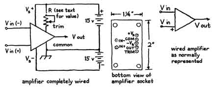 "Differential operational amplifiers are made in two ways. One type is assembled with discrete parts: transistors, resistors, capacitors and related components. They are self-contained. The second type is made by chemically treating a small wafer of silicon. This type requires the addition by the user of several accessory parts. The following discussion is based on amplifiers of the self-contained type. "Typically they resemble a small block of plastic about an inch square and ha]f as thick. Seven short stubs of wire protrude from one side of the device; they are the terminals. The internal parts include complementary transistor circuits, each consisting of several stages of amplification that terminate in a single output, plus a number of auxiliary circuit elements that automatically compensate for changes in temperature and voltage supply and for aging effects. Familiarity with the details of these highly sophisticated circuits is not essential for putting the amplifier to work. With a basic understanding of how the device operates the beginner can immediately use it as a fundamental building block in instruments and apparatus of many kinds. "In performance the differential operational amplifier can be roughly likened to a galvanometer with a pointer that makes frictionless contact with a resistance wire [see illustration at right]. The center of the movable coil of the galvanometer is connected to ground or to the chassis on which the instrument is mounted by a flexible lead. The center of the resistance wire is similarly grounded. A potential of 20 volts is maintained across the resistance wire by a pair of batteries connected in series. The connecting wire is also grounded. "The sensitivity of the hypothetical galvanometer is such that a potential of 40 microvolts, applied between either end of the coil and the ground, causes the pointer to move from its normally centered position to one end or the other of the resistance wire, depending on the magnitude and polarity of the applied voltage. A flexible wire connected to the pointer, which is insulated from the coil, serves as the output terminal. "The assembly is an amplifier. Application of 40 microvolts between either end of the coil and the ground causes a potential of 10 volts from the battery to appear between the output terminal and the ground. The voltage gain is therefore 250,000. "A galvanometer has an adjustment screw for centering the pointer on zero at the mid-scale position. When the pointer is centered, no output voltage appears. The differential operational amplifier works the same way, but its response is much faster and more precise than that of an electromechanical device. "The amplifier is depicted in wiring diagrams by a triangle [see illustration at left]. Two short lines that extend from the base of the triangle represent the input terminals, one positive and one negative. The output terminal is represented by a similar line at the apex. Two lines that extend from opposite sides of the triangle near the base represent positive and negative terminals for connection to a pair of external power supplies, each providing a potential of 15 volts. The power supplies are connected in series by a grounded wire. "The seventh terminal of the amplifier, known as the trim, is represented by a line adjacent to the positive power terminal. It is analogous to the zero screw of the galvanometer. A variable resistor connected between the trim terminal and the positive power terminal can be adjusted to the point where no output voltage appears until a signal is applied to the input. "Wiring diagrams are frequently simplified by the omission of the power-supply connections, the trim adjustment and most of the ground connections. It is understood that these connections are invariably required. Currents from the signal source and the load always return through the ground. Nearly all operational amplifiers fit interchangeably into a standard socket. Printed labels on the bottom of the socket identify the terminals. "The performance of all
