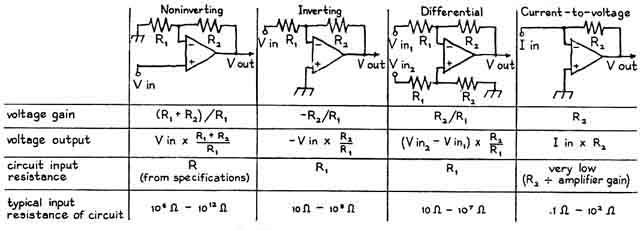 from "The 40J amplifier requires an external, variable trim resistor of 1,000 ohms and the 118A a similar resistor of 50,000 ohms. To make the trim adjustment ground both input terminals of the amplifier, apply power and set the variable resistor to the point where the voltage output falls to zero, as indicated by a voltmeter. I was unable to find a source of 15-volt batteries, but the Mallory Type TR-289 batteries that develop 12 volts are adequate. A special power supply manufactured by Analog Devices and specifically designed for operational amplifiers is available from Techno-Scientific. "Typically the devices can amplify the voltage of a direct-current signal by a factor of 200,000 or more. That much gain is rarely needed. Instead part of the output voltage is returned in opposition to the signal. This opposing voltage, a negative feedback, cancels some or all of the gain and in so doing stabilizes the performance of the overall circuit, much as the governor of a steam engine stabilizes the speed of the flywheel in spite of changes in the load. In effect, negative feedback converts the operational amplifier into a precision device. "In general the amplifiers are used in one or another of four basic wiring schemes: noninverting, inverting, differential and current-to-voltage conversion circuits. The choice for a specific application depends largely on the internal resistance of the signal source, the amount of current or voltage that can be taken from the source and the amount of gain that will be required to operate the load. With this information at hand the design of a desired apparatus needs only a bit of arithmetic, in contrast to the tedious and complex equations that must be solved to design an equivalent circuit with transistors. "Assume that the experimenter wants to measure the voltage across the mercury-dropping electrode of a polarograph, the low potential stored by a small capacitor or the bioelectric potential generated by the heartbeat of a microscopic animal such as the water flea Daphnia. The voltage of such a source falls if current is drawn from it, thus spoiling the measurement. The measuring instrument must present high resistance to the source-so high that almost no current is drawn. An ideal instrument for such a measurement is an operational amplifier wired in the noninverting configuration. The input resistance ranges from a million ohms to a million megohms, depending on the characteristics of the amplifier. The polarity of the output signal is the same as the polarity of the input signal, hence the name noninverting. "The inverting configuration