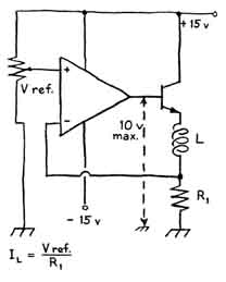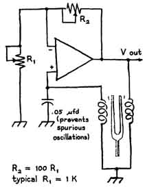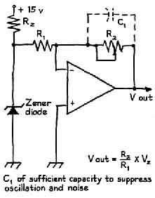 something equally inconvenient. Substitute a variable resistor for R "Many experiments require a source of current for developing a constant mechanical force, a constant electrochemical reaction, a constant source of light and so on. A convenient source of constant current can be made with the noninverting configuration. For example, a vernier for an analytical balance can be easily improvised for splitting the final milligram into fractions. "The vernier consists of a small solenoid that applies a variable force to one end of the beam. An operational amplifier provides current to the solenoid and so controls the force. The armature of the solenoid can be a bit of iron wire snipped from the end of a paper clip. The coil of the solenoid can be a 1,000 microhenry choke of the kind that has an air core. "Cement the iron wire to one end of the beam with a dab of epoxy. Restore the beam to balance by adding a counterweight to the opposite end. Rigidly attach the coil to the frame of the balance at a point where the armature extends partway into the air core. Current in the coil is adjusted by a potentiometer that applies a voltage to the input of the amplifier [see illustration at left]. I used a 10-turn potentiometer and calibrated its scale in intervals of 10 micrograms. The magnitude of the force can be increased by adding a transistor to the output of the amplifier. "The 40J amplifier can be employed as an electrostatic voltmeter for measuring potentials up to 10,000 volts to an accuracy of about 2 percent. The circuit includes a voltage divider consisting of two capacitors. The smaller capacitor, preferably one of the type that is insulated with glass plates in oil, is first charged by voltage from the source through a single-pole, double throw switch [see illustration at right below]. Charge so acquired is transferred to the larger capacitor by operating the switch. The larger capacitor should be insulated with polystyrene. "The output voltage is