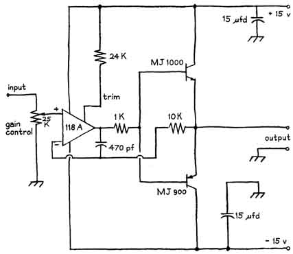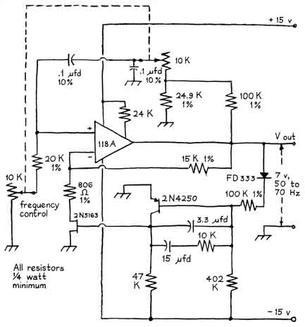 by momentarily closing the single-pole switch (Sw "Equally interesting are applications that involve automatic control. An example is an apparatus for maintaining a substance (such as a fluid) at a desired temperature. Input voltage for the amplifier is obtained from a Wheatstone bridge, one arm of which includes a thermistor as the temperature-sensing device. Current in the output is boosted by a transistor for operating a relay that turns a heating element on and off. The desired temperature is set by a variable resistor that is the balancing arm of the bridge. A diode suppresses the pulse of high voltage that appears across the coil of the relay at the instant the amplifier shuts off the current [see illustration at left below]. Thermistors are available in a range of resistances from dealers in radio supplies. The resistors in the bridge should equal the resistance of the thermistor at a temperature of 25 degrees Celsius. The apparatus will respond to changes in temperature of less than one degree C. "Although the operational amplifier is primarily a direct-current device, designers find numerous uses for it in alternating-current circuits, particularly at frequencies below 10,000 hertz (cycles per second). The gain of the amplifier is maximum for direct current and falls uniformly to unity at about one megahertz. In a typical application the amplifier generates an alternating current for driving a tuning fork of the kind used as the time reference in watch regulators. The tuning forks are available inexpensively on the surplus market. "The tuning-fork assembly includes a pair of electromagnets. One drives the fork. The other generates signal voltage for the amplifier. The fork vibrates at a constant frequency of 400 hertz. It develops some output even when it appears to be at rest. The tines are never still but oscillate continuously at low amplitude in response to external vibrations. Although at this amplitude the electrical output amounts to less than a microvolt, it can be detected by an operational amplifier in the noninverting configuration [see illustration at right below]. "When the amplifier is turned on, nothing seems to happen for about a minute. A discernible voltage then appears at the output of the amplifier. During the next three minutes the amplitude of the output voltage gradually increases to approximately 10 volts. By connecting an oscilloscope to the output you can watch the initially faint signal fight its way up through the noise to emerge as a perfect sine wave. The stability of the signal approximates one second per month. "The 118A amplifier becomes an impressively stable oscillator in its own right when it is combined with a few capacitors and resistors, a diode and a couple of transistors. The accompanying circuit configuration [illustration at left] was designed specifically to generate an alternating voltage with a frequency that can be varied continuously from 50 to 80 hertz. If the oscillator is combined with a power amplifier, the output can be harnessed for driving a telescope of any size in synchrony with the apparent motion of the fixed stars. The driving rate can be altered at the twist of a knob for locking the telescope onto the moon, the planets and comets. The short-term frequency stability of the oscillator is significantly better than that of 60-hertz power lines. "The oscillator delivers an output of seven volts in the form of a sine wave of less than 1 percent distortion. The oscillator is automatically stabilized by a variable resistance consisting of a field effect transistor (2NT5163) in series with a fixed resistor of 806 ohms. The resistance of the field-effect transistor is controlled by the amplitude of the output voltage. Part of the output is rectified by the diode and compared with the power-supply voltage by means of the 2.N4250 transistor, which functions as an integrating amplifier. The difference voltage controls the resistance of the field-effect transistor. "A power amplifier that is designed to operate as a companion to the oscillator but can be employed for other purposes delivers up to nine volts at a maximum current of two amperes [see illustration at right]. The output potential of the amplifier can be increased to 120 volts by a transformer for operating a synchronous motor, such as the Hansen Synchron Type 900. The motor, when it has been geared down to the rate of one revolution per sidereal day, can exert a maximum torque of 150 foot-pounds on the polar shaft of a telescope. "Operational amplifiers are designed to perform mathematical operations such as adding, subtracting, generating logarithmic functions and solving problems in the differential and integral calculus. This implies that they can perform almost any operation that can be described by an elementary mathematical equation and suggests something of their versatility as well as the breadth of the experimental opportunities opened by their development."