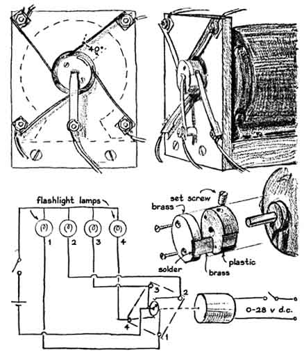 the output potential of IC "The device for demonstrating critical flicker frequency consists essentially of a shutter for interrupting light, such as the beam of a 35-millimeter slide projector. The shutter assembly includes a pair of identical opaque disks, each with an opening in the form of an arc [see illustrations right and lower left]. The pair of disks is rotated by a variable-speed motor. "The effective size of the opening can be adjusted by rotating one disk with respect to the other and clamping the pair at the desired position. If the arcs span 90 angular degrees and the openings coincide, the intervals of light and darkness are equal. The ratio of light to darkness can be reduced by adjusting the angular displacement of the disks. "Small direct-current motors that operate on 28 volts are available inexpensively on the surplus market. Our shutter is rotated by a motor of this type. Doubtless it would be possible to clamp the disks to the shaft of the motor with a pair of rubber grommets, although we used a wheel adapter. We calibrated the flash rate with a stroboscope. Alternatively, one could put on the disks a series of stroboscopic patterns like those used for checking the speed of phonograph turntables. "It is possible to build an electromechanical device for demonstrating the phi phenomenon by using an improvised rotary switch for actuating two or more miniature lamps. The switch could be operated by the same motor that rotates the shutter. Flashlight bulbs can be used for light sources at speeds of up to about 15 flashes per second. At higher rates the effects of thermal inertia become apparent: the filaments continue to glow somewhat during the dark interval. "Gas discharge lamps can be substituted for experimenting at higher flicker rates. Miniature neon lamps rated from 1/17 watt to three watts are available from dealers in electronic supplies. They emit red light. The Brite-Glo neon lamp with a crater electrode is recommended for this application. Argon glow lamps rated up to two watts are also available. They emit a pale violet-blue light. "Details of the construction are shown in the accompanying illustration [right]. The ratio of the light and dark intervals is fixed in the electromechanical device, which is also less flexible in other respects than the electronic apparatus. Even so, the phi phenomenon can be observed if the lamps are viewed at normal reading distance.